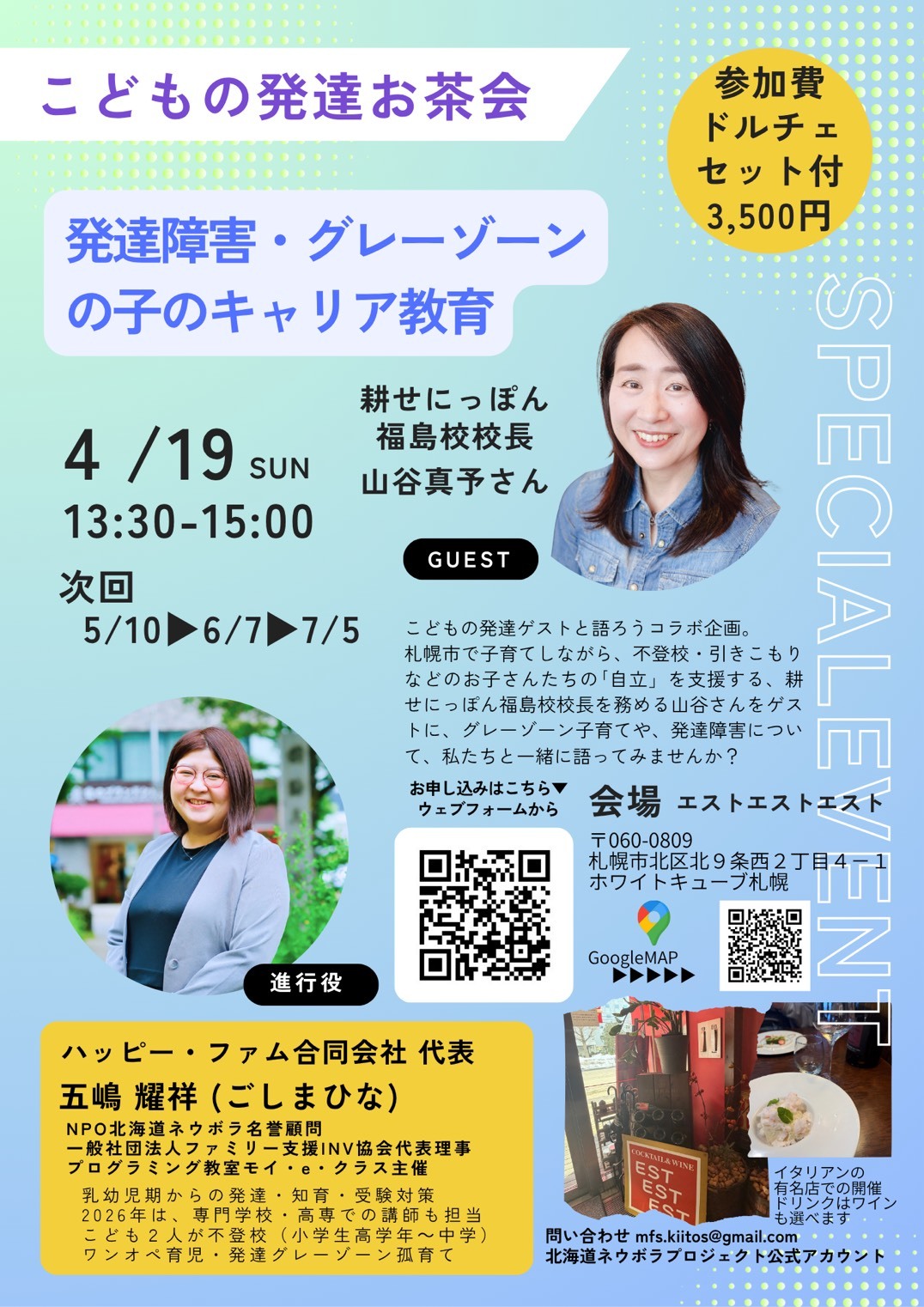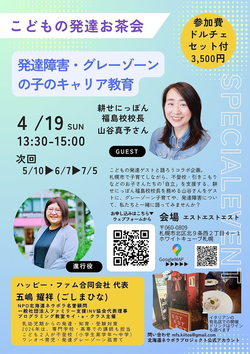 不登校や引きこもりの自立支援を行う山谷真予さんをゲストに迎え、発達障害や子育てについて語り合うコラボ企画です。イタリアンレストランのドルチェセットを楽しみながらご参加いただけます。