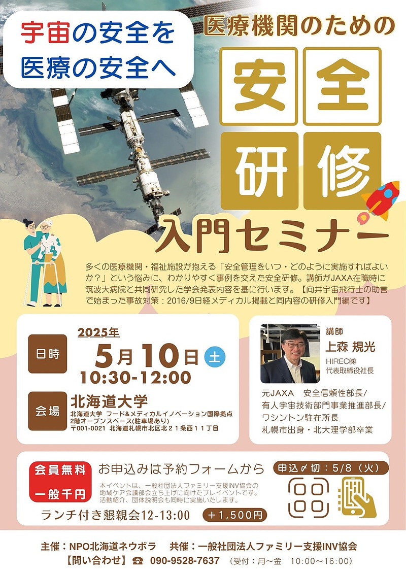 多くの医療機関・福祉施設が抱える「安全管理をいつ・どのように実施すればよいか?」という悩みに、わかりやすく事例を交えた安全研修。講師がJAXA在職時に筑波大病院と共同研究した学会発表内容を基に行います。