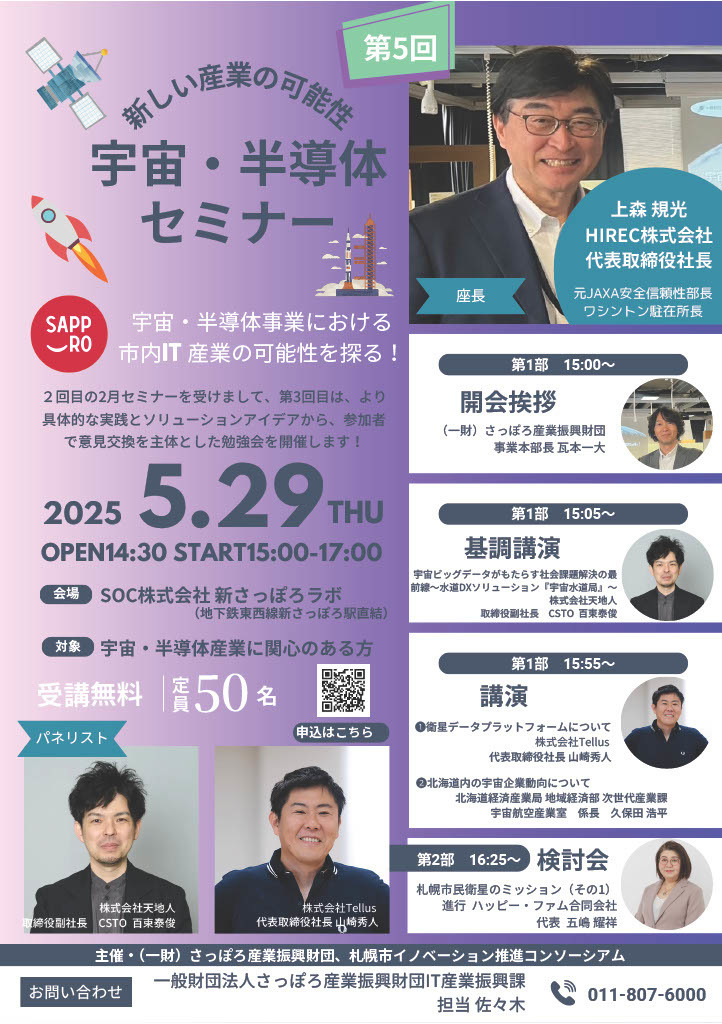 今回は、宇宙データの具体的な利用について考えるため、株式会社天地人、株式会社Tellusの取り組みについてお話をお伺いする他、北海道における宇宙関連企業の動向をご紹介いただき、市内IT産業における「次のビジネス」の可能性を探ります。
