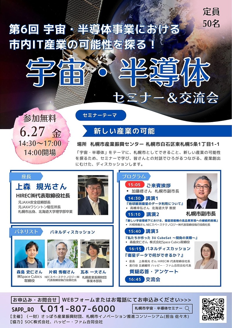 「宇宙・半導体」をテーマに、札幌市としてできること、新しい産業の可能性を探るため、セミナーで学び、皆さんとの対話でひろがるつながる、産業創出に向けたディスカッションをします。