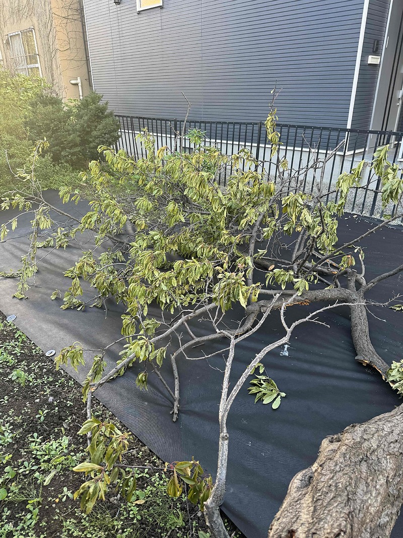 ・下の写真のように弱っている木の根元に防草シートを敷くと早々に致命的になります。