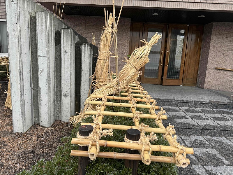 寄せ植えのサツキツツジとシャクナゲの冬囲い。シャクナゲにはムシロを施してあります。