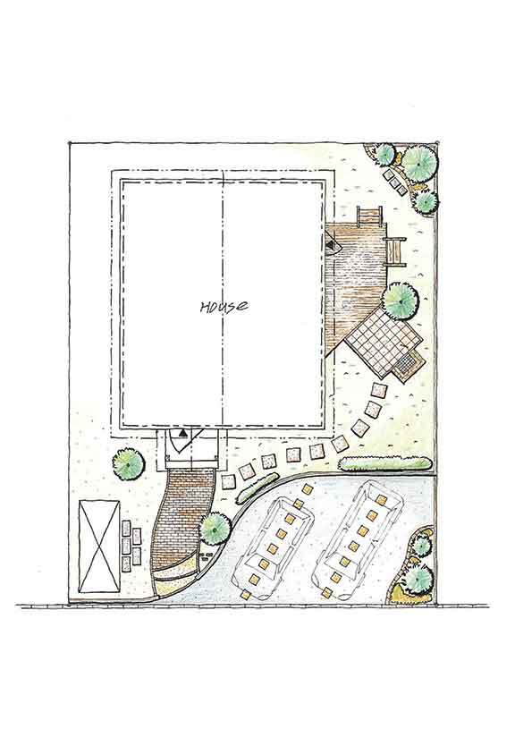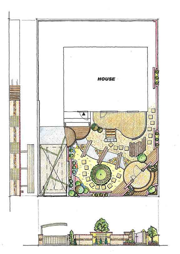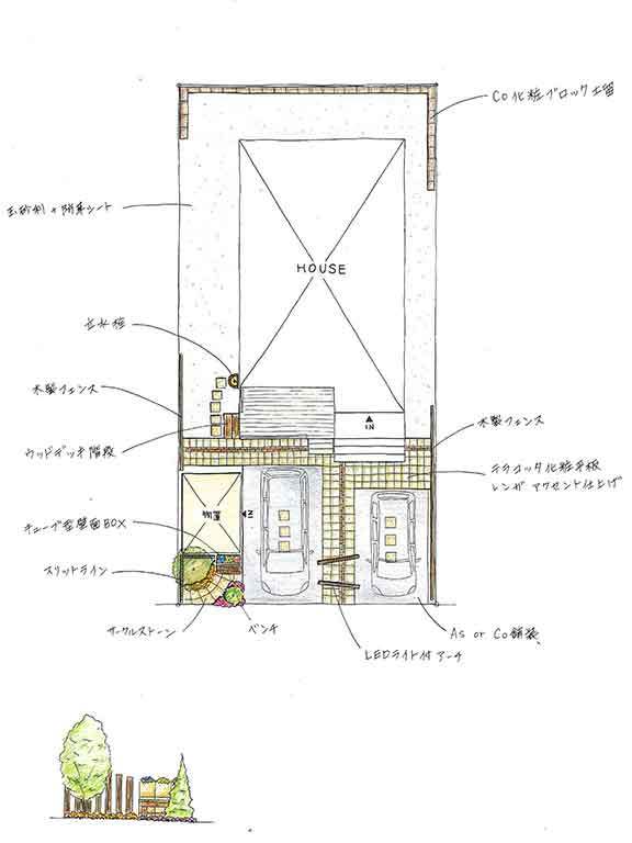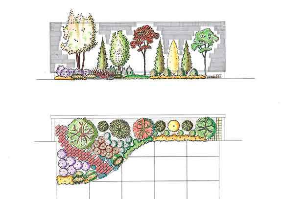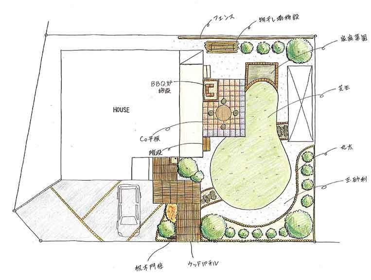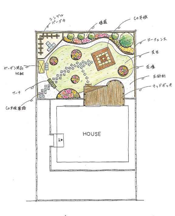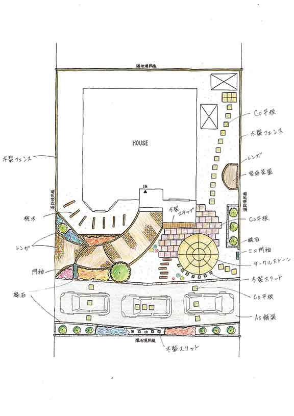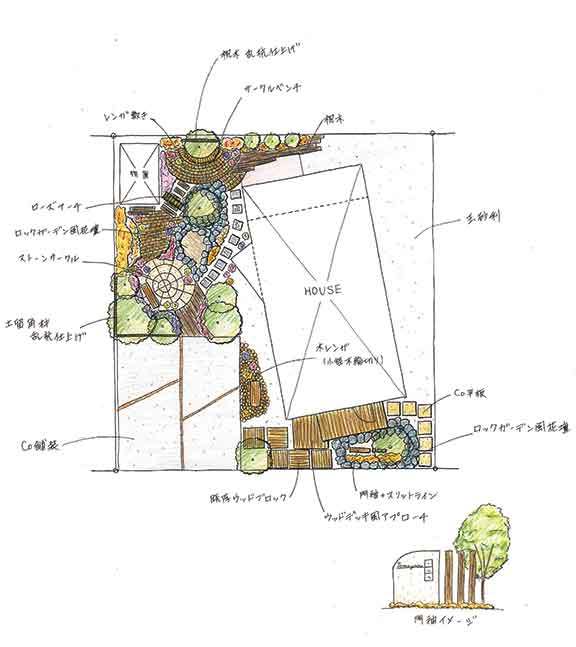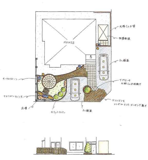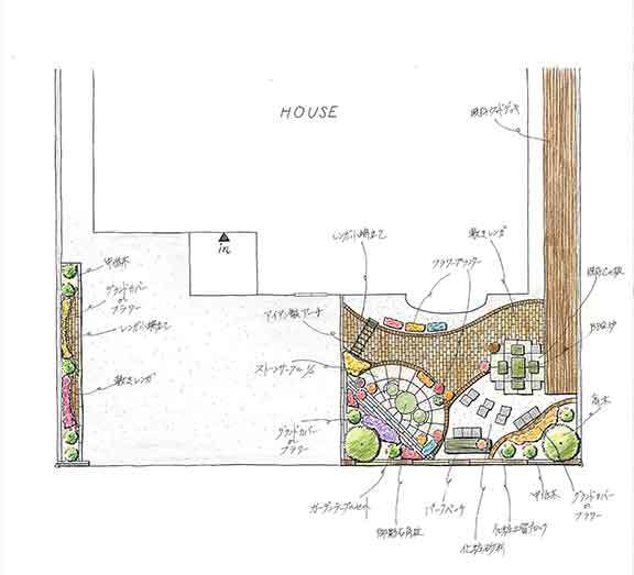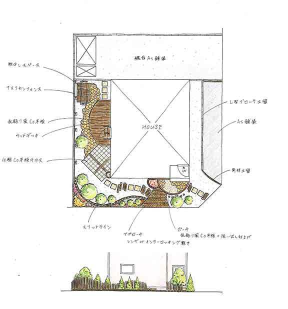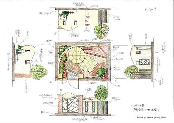 「ガーデン&エクステリア」づくりには必須の、いわゆる”お庭の間取りプラン”の一例です。施主様にご提案する際やグランドデザインでのご提案をさせていただく場合、手描きによるプレゼンテーションをさせていただくことがある平面図と立面図です。素朴で味わいのある図面の一例をぜひご覧ください。