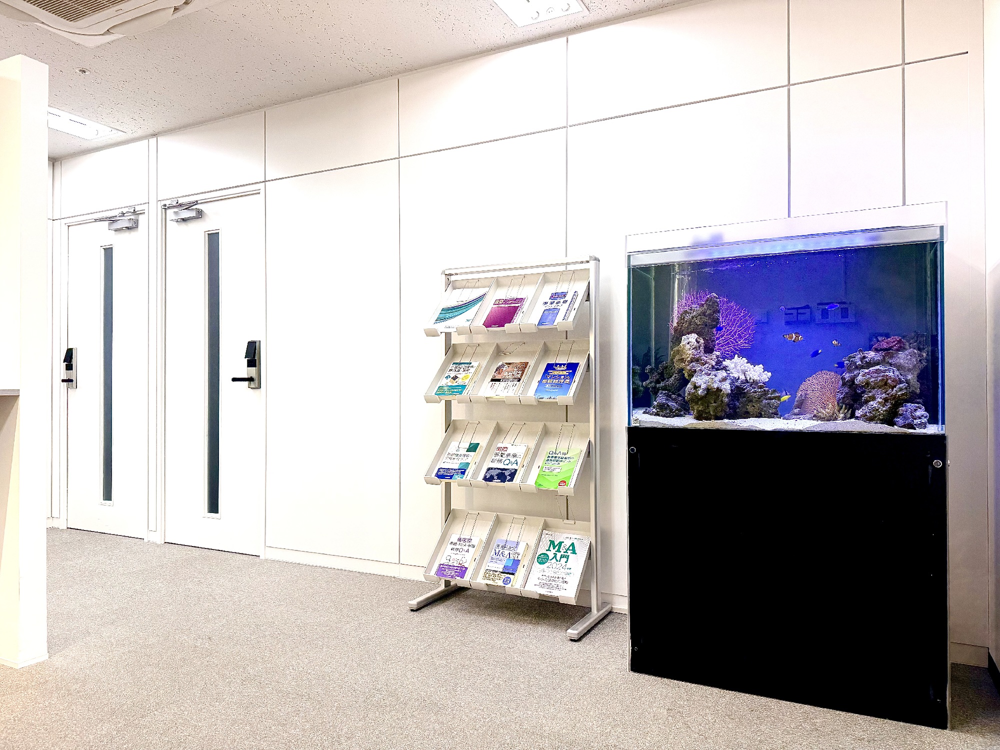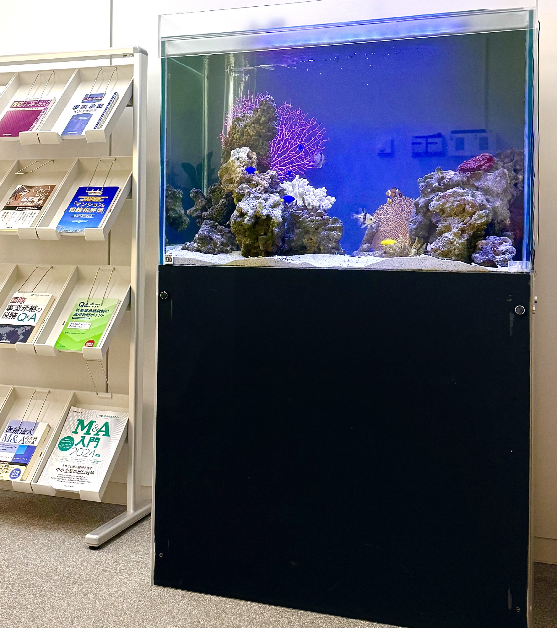 会計事務所の待合室に設置した海水水槽の一例です。 数字や判断が交わされる空間において、過度に主張せず、場の緊張を和らげることを意識して構成しています。 白を基調とした内装に対し、色彩は抑えながらも、視界に入ったときに呼吸が整うようなバランスを心がけました。 水槽は空間の主役ではなく、静かに場を支える存在であると考えています。