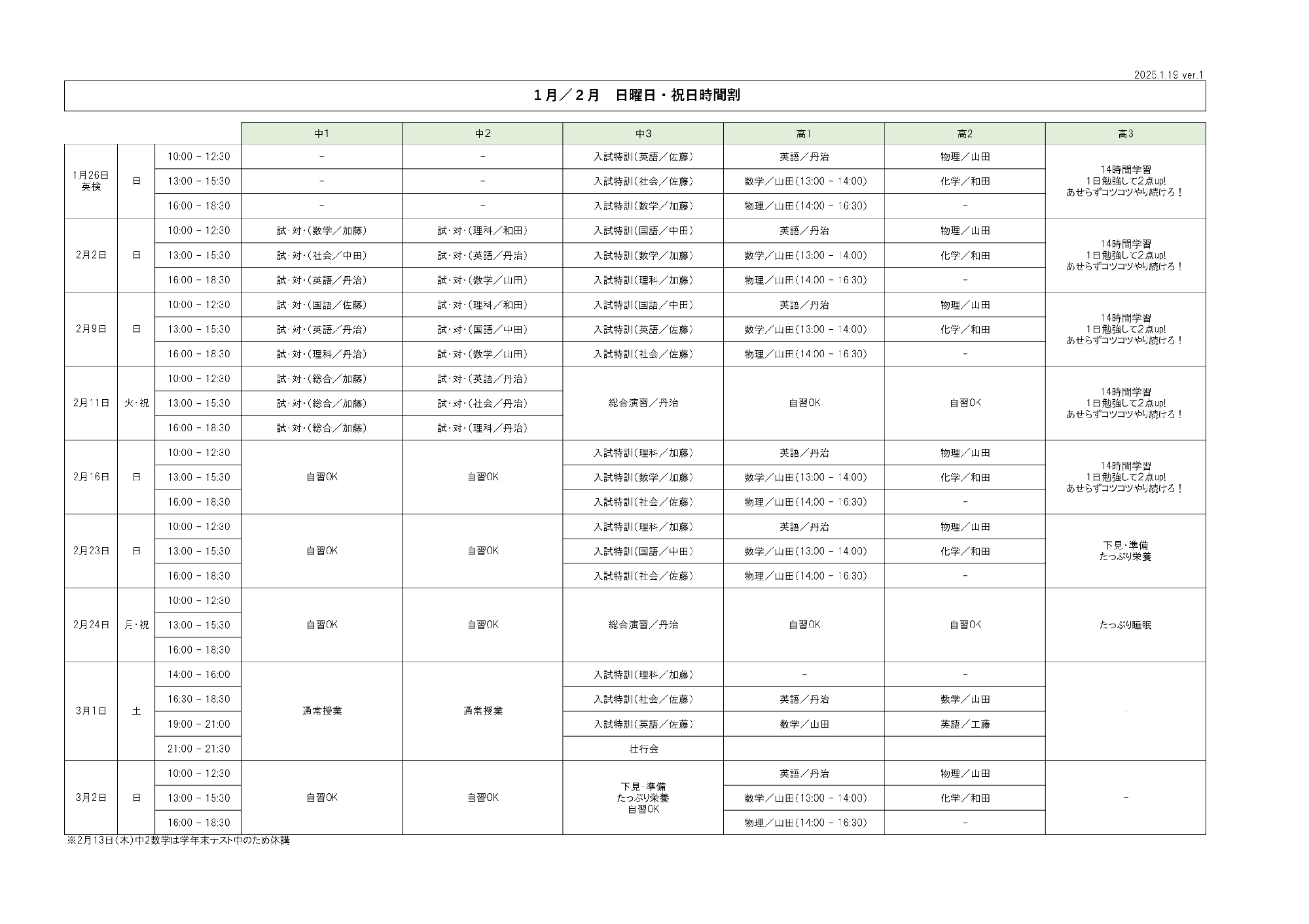 高3の皆さん、共通試験お疲れさまでした!二次試験へ向けて残り1か月間は1日14時間の勉強時間を確保してください。