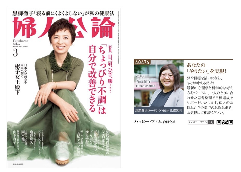 2025年2月15日(土)発売の「婦人公論 2025年3月号」に五嶋耀祥さんが掲載されました。特選百科の特集ページにて、課題解決コーチングサービスについて紹介されています。
