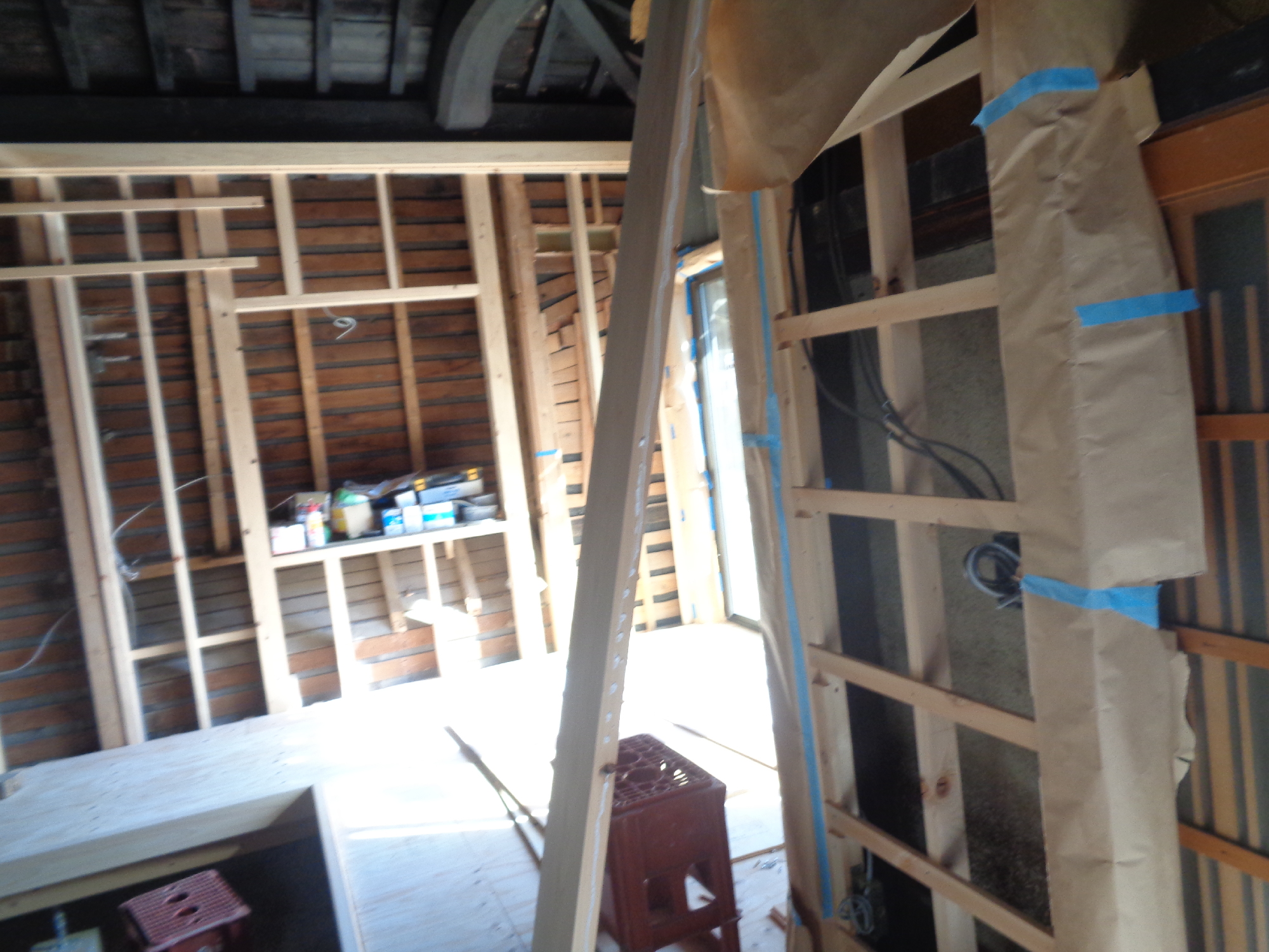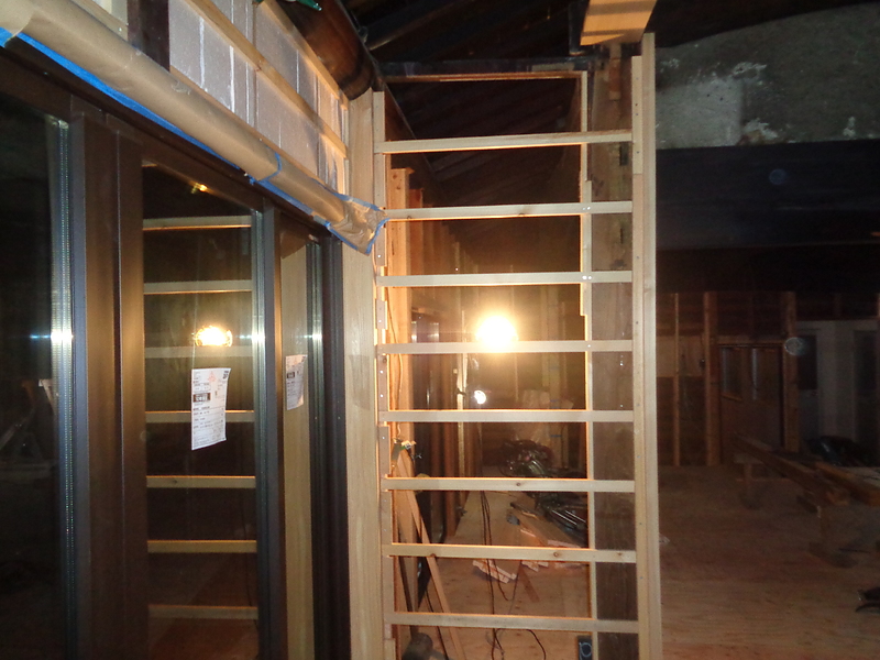下地の赤松の胴縁を取り付けます。(現状より柱等を傷めない工夫)