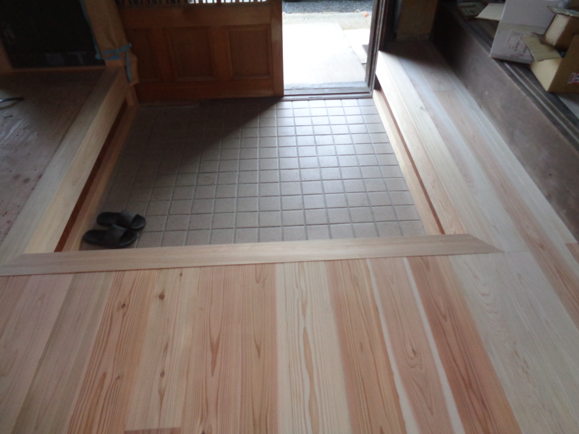 玄関廻りに少し節のすけない床材を、寄って貼っていきます