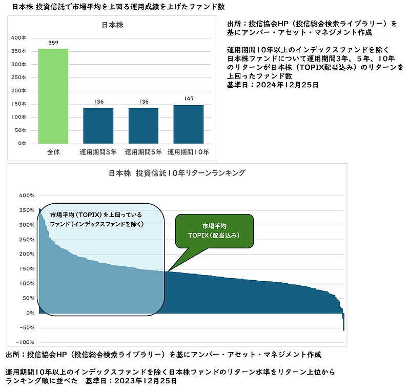 最近では「アクティブファンドは、パフォーマンスが悪いものが多くコストも高いから、市場平均(インデックス)に連動する低コストのインデックスファンドが望ましい」という声もよく聞きますが、実は運用実績で比較すると、直近(2024年12月25日)時点で約4割の日本株ファンドが市場平均であるTOPIX(配当込み)を3年間から10年間のリターンで上回っています。