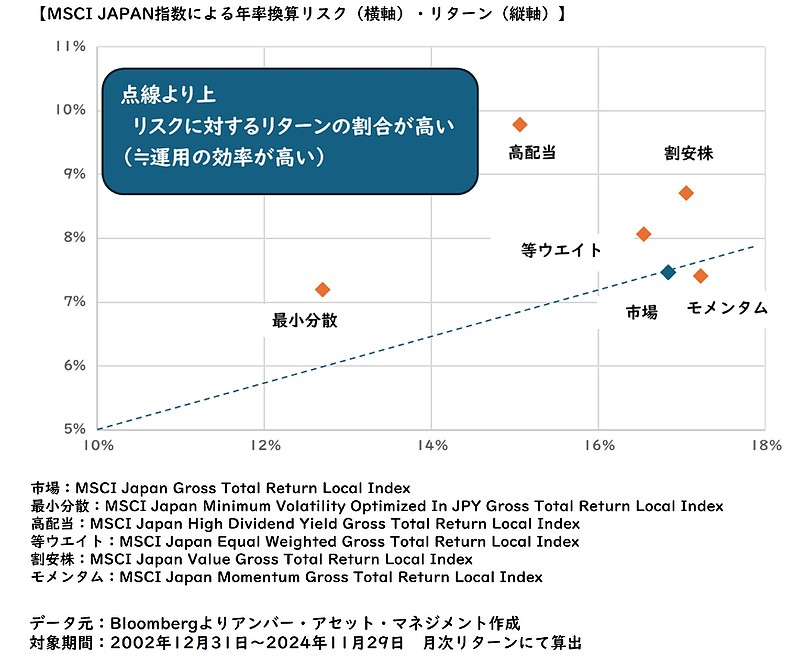 2002年末から2024年11月末までの期間で計測した年率換算リスクとリターンをプロットして、リスクに対するリターンの割合から運用の効率性を比較すると、日本株には以下の様な特性があります。