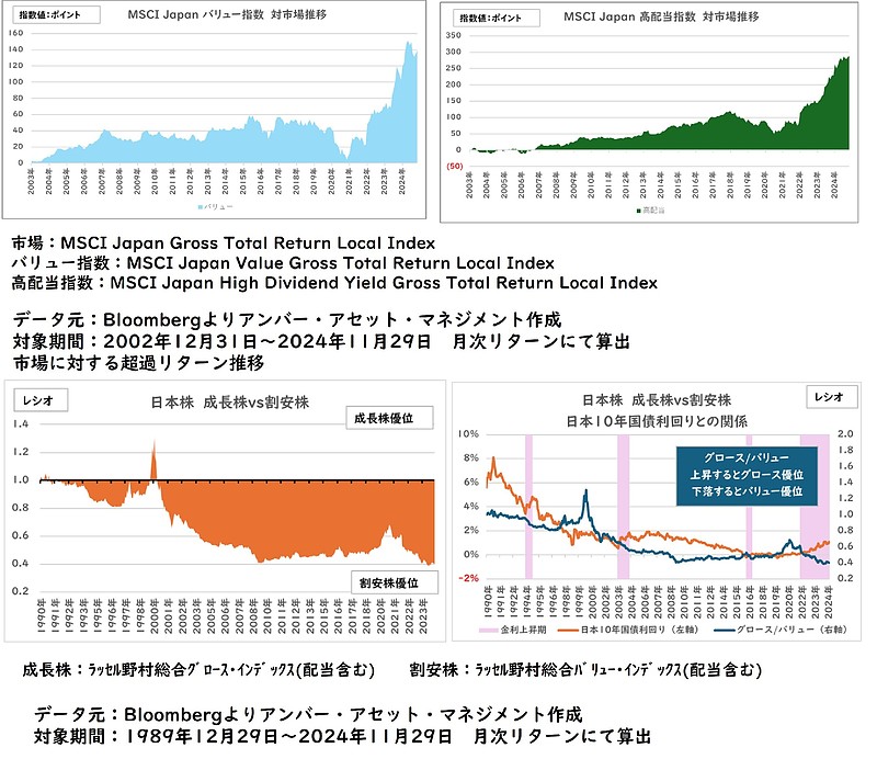 2点目の高配当指数や割安株指数ですが、全体を通じてプラスとなっており、超過リターンの視点からも良い結果となっています。1990年以降で日本株の割安株と成長株とを比較しても、2000年初頭のITバブル期や2010年代後半を除いて、割安株が優位となっており、日本株は割安株が優位な市場であると言えます。
