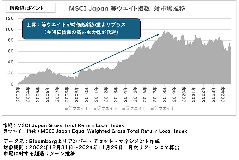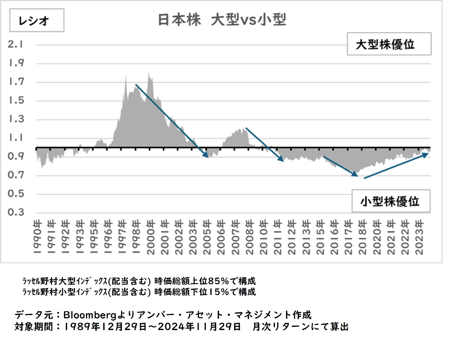 日本株は小型株に有利な市場と言われていますが、その関係は2000年代から2010年代後半にかけて見られていました。それが2020年以降になると大型株が有利な状況に転換して、1990年からのトータルで見ると中立的な結果となっています。