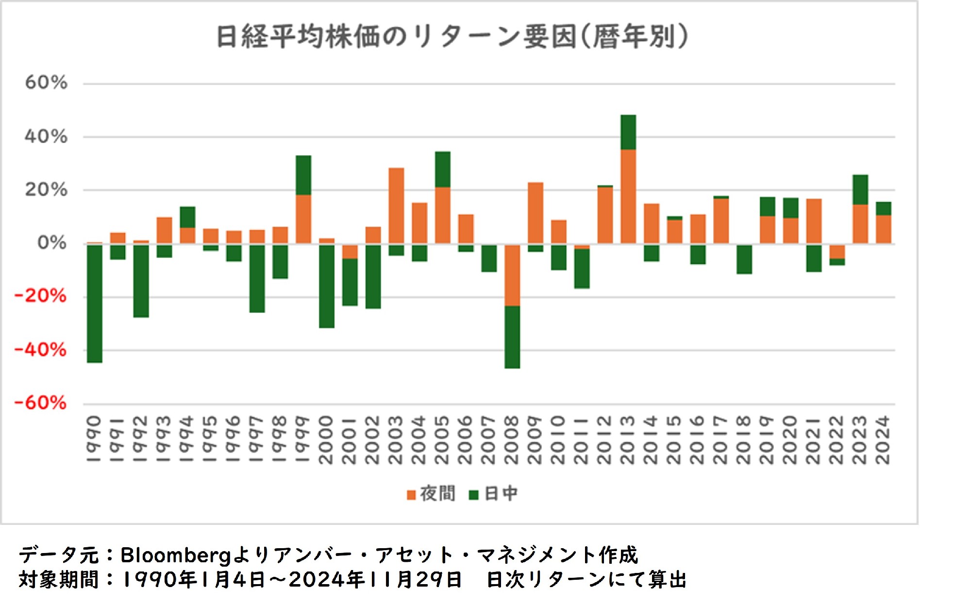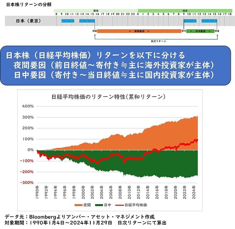 代表的な日本株指数である日経平均株価の日次リターンを前日の終値から当日の寄付きまでのリターン(≒夜間要因)当日の寄付きから当日の終値までのリターン(≒日中要因)に分けて、