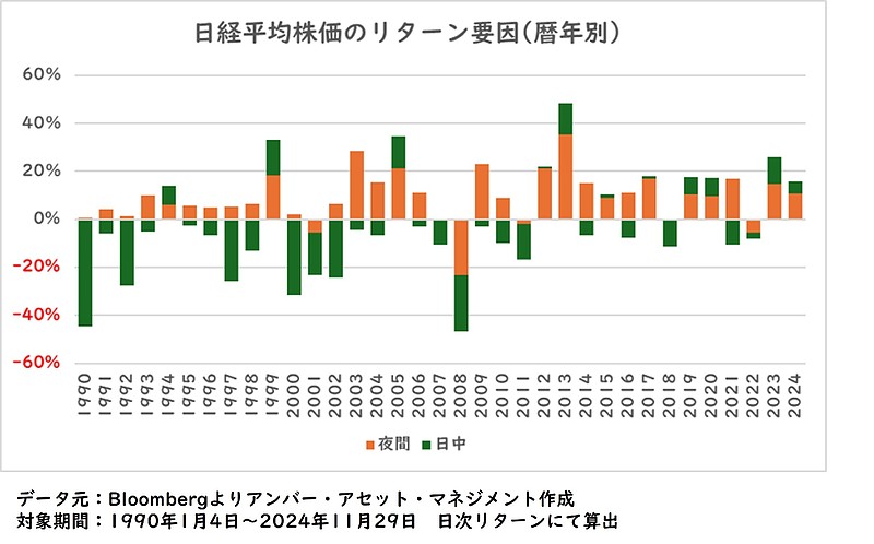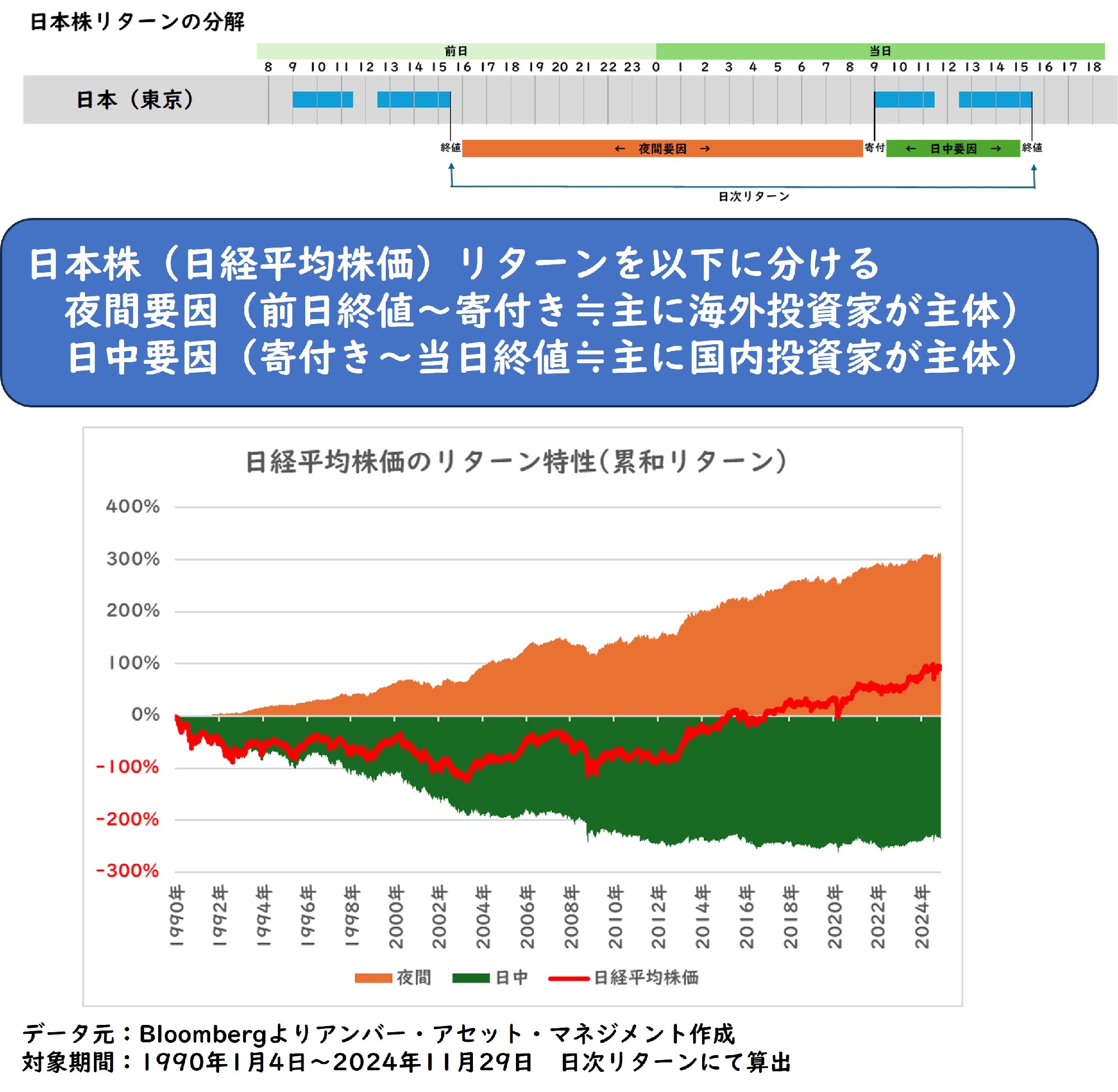 一方で日中要因は国内投資家が主体となっています。1990年代からのマイナスは日中要因のマイナス寄与が大半となっており、2010年代までの日本株低迷は国内投資家が日本株を敬遠したことを反映していました。そして、日中要因のマイナスが落ち着いた2010代以降になると日経平均株価が上昇に転じるようになっています。