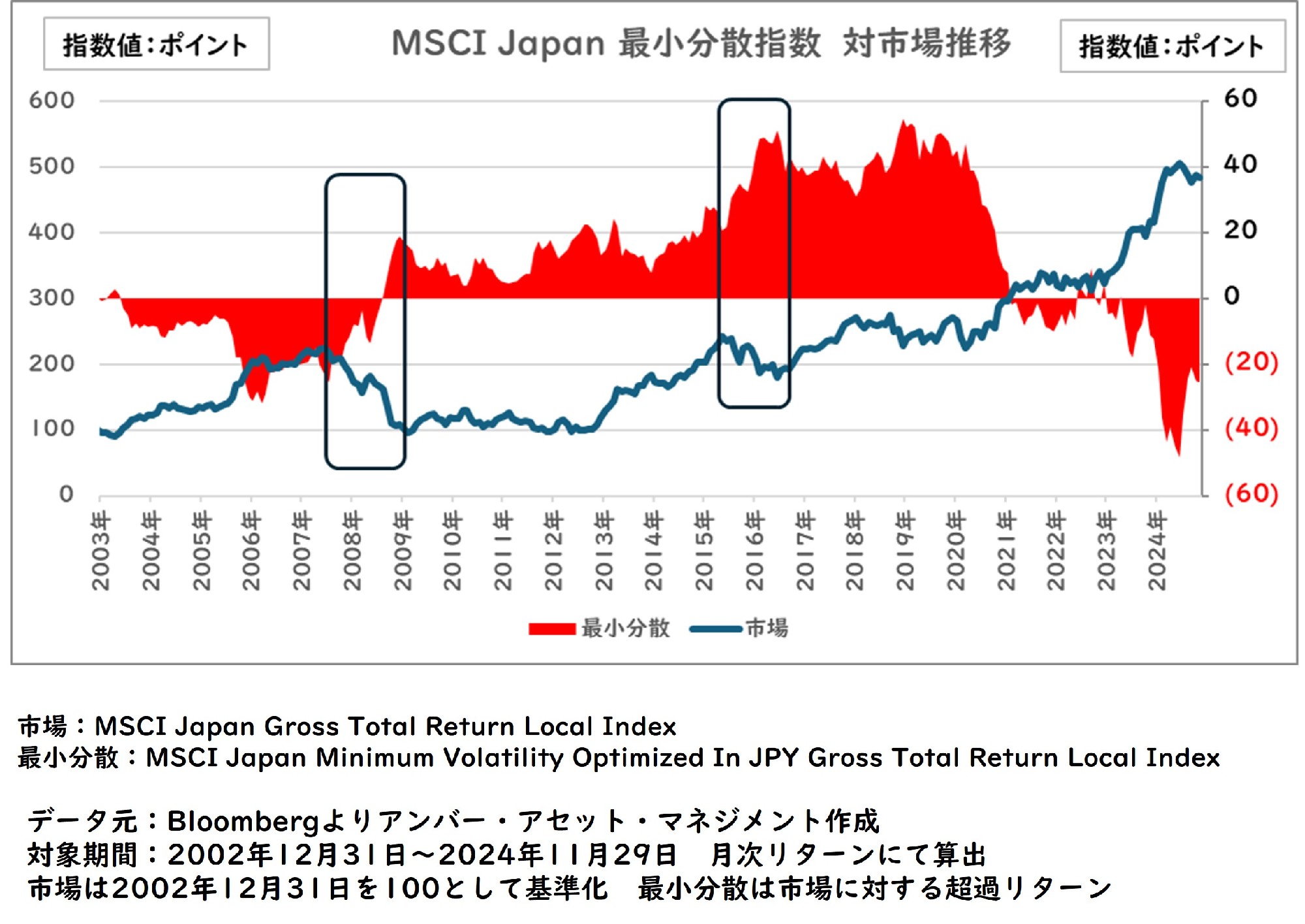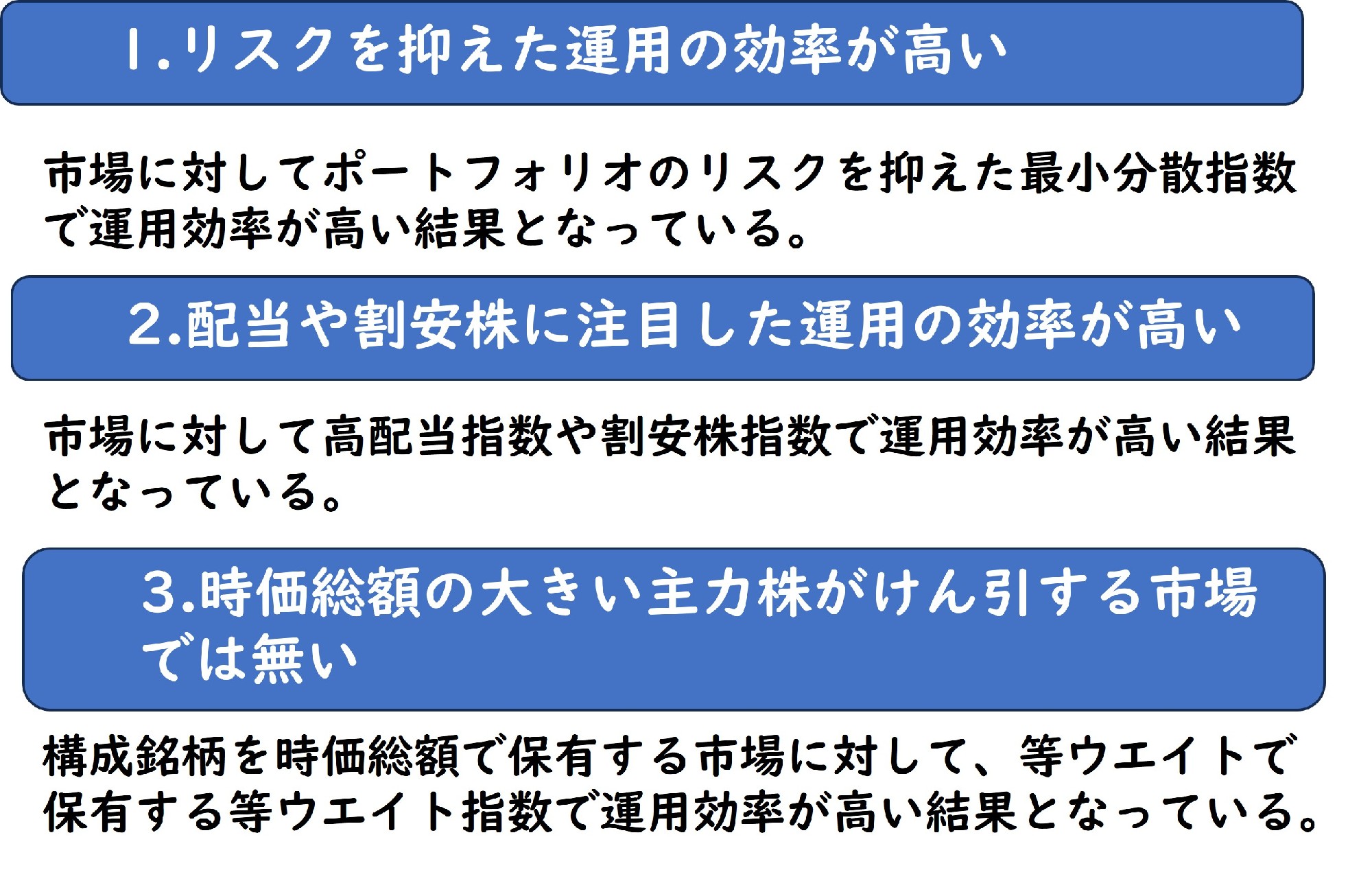 まず、1点目の最小分散指数ですが、市場が低迷すると超過リターンがプラスとなる傾向があり、市場が低迷している際はリスクの高い運用は回避した方が良く、同じタイプの運用の中ではリスクを抑えた運用の方が良いと言えます。