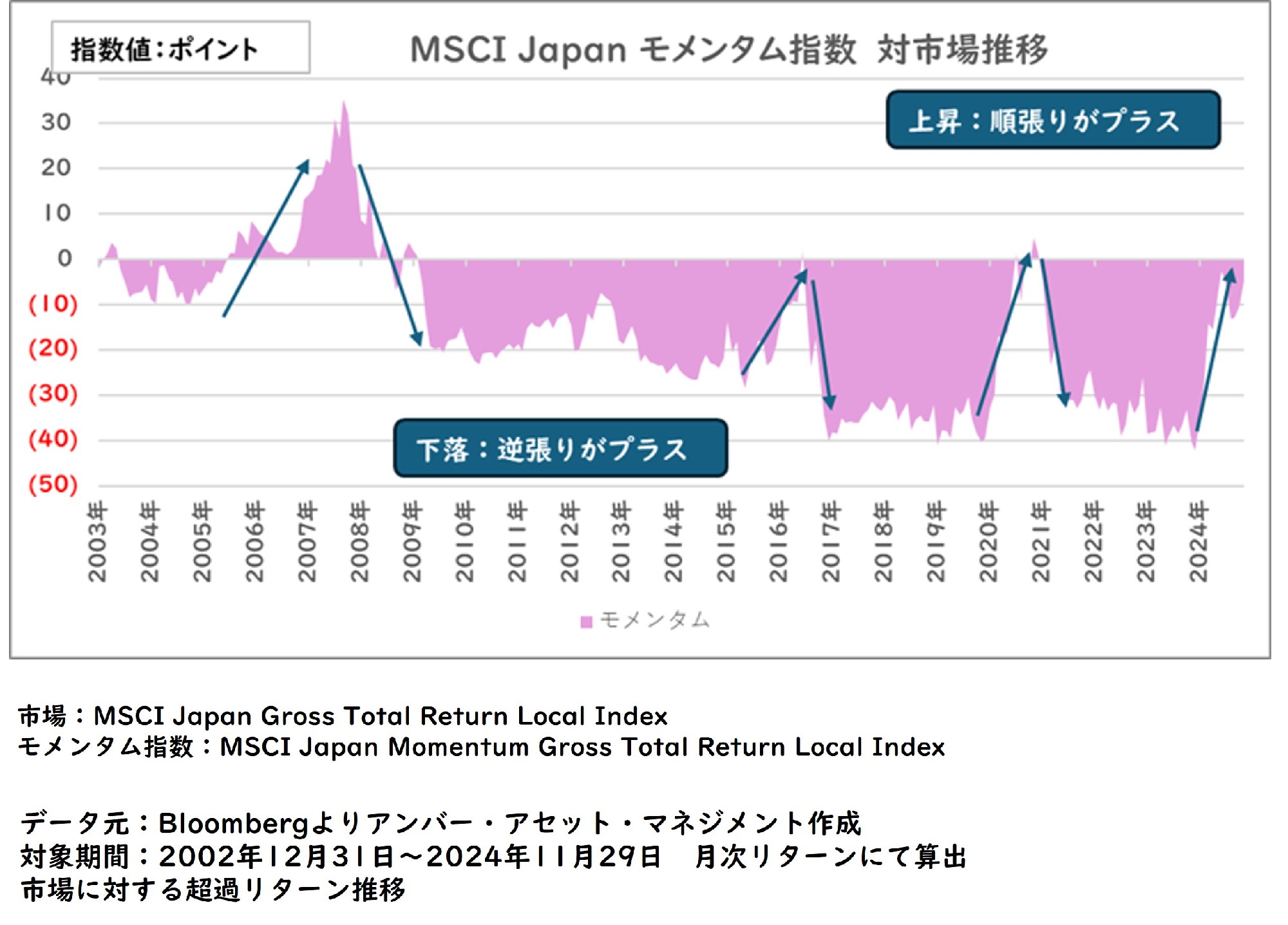 また、市場に対する運用効率では同程度であったモメンタム指数について超過リターンの動きを見ると、時期によってプラスとマイナスが交互に現れています。