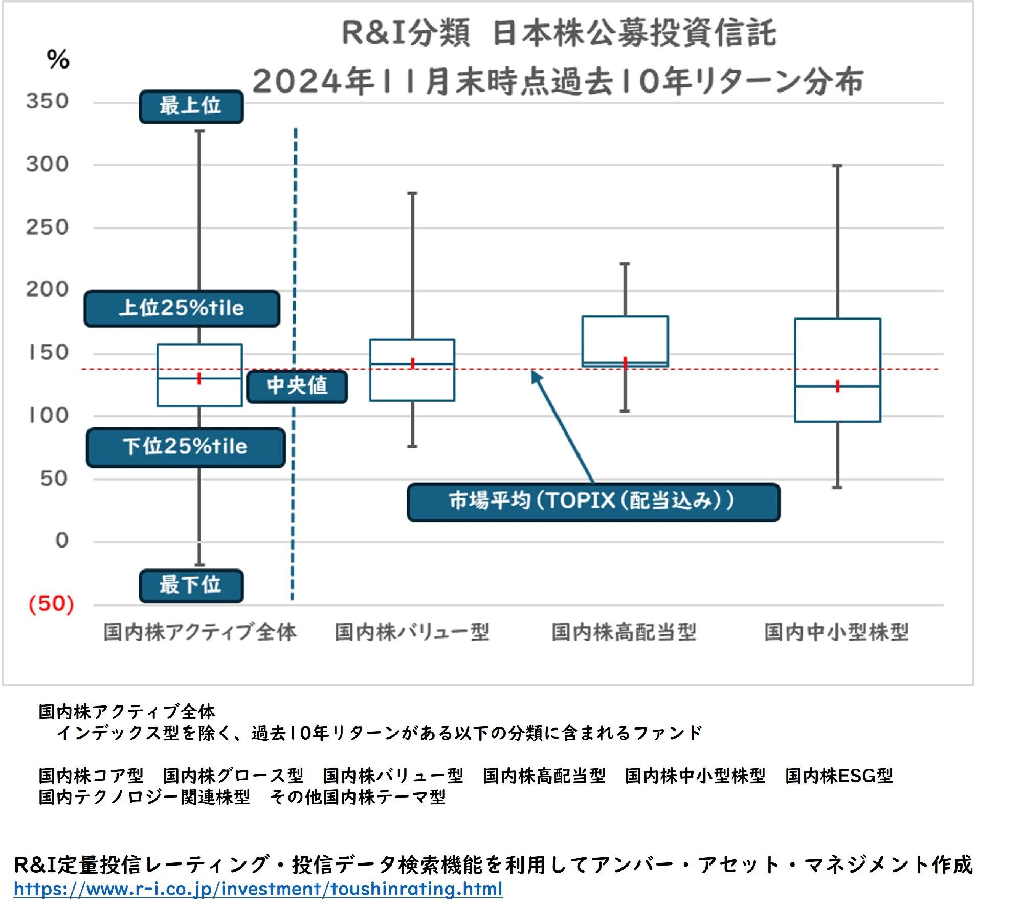 ここでは日本を代表する格付会社であり、信用格付をはじめ年金運用コンサルティング・投信評価など、様々な金融情報サービスを提供しているR&I格付け投資情報センターの 定量投信レーティングで使用されている分類から、2024根円11月末時点での過去10年リターンについてインデックス型を除いた日本株ファンドのリターン分布について見ると以下の3点を確認できます。