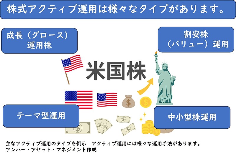 米国株も含めて株式の投資信託には様々なタイプの運用があります。所謂、アクティブ運用についてもグロースと呼ばれる成長株運用やバリューと呼ばれる割安株運用、様々な投資テーマに着目して運用するテーマ型や中小型株運用などもあります。