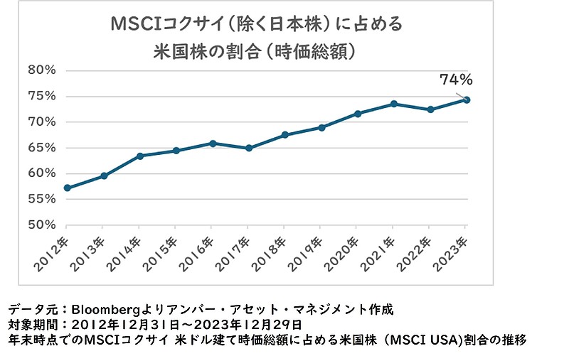 お客さまには外国株に投資する投資信託をご検討されている方も多いのではないでしょうか。日本を除く先進国株を代表するインデックスであるMSCIコクサイの時価総額に占める米国株の割合は、2023年末で約3/4程度と大きな割合を占めているので、ここではグローバル株の大部分を占める米国株について触れているとご認識して頂ければと思います。