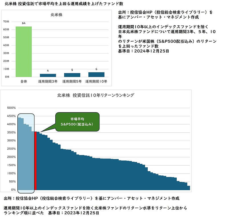 最近では「アクティブファンドは、パフォーマンスが悪いものが多くコストも高いから、市場平均(インデックス)に連動する低コストのインデックスファンドが望ましい」という声もよく聞きます。実際に運用実績で比較すると、直近(2024年12月25日)時点で米国株が主体の北米株型のファンドで市場平均であるS&P500(配当込み)を3年間から10年間のリターンで上回っているのは、わずか1割程度です。