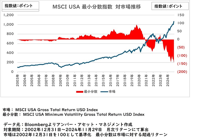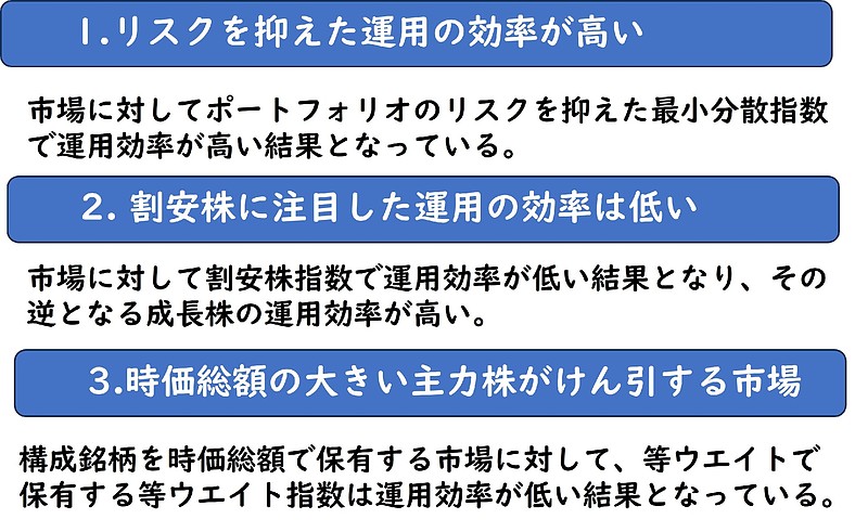 まず、1点目の最小分散指数ですが、市場が低迷すると超過リターンがプラスとなる傾向があり、市場が低迷している際はリスクの高い運用は回避した方が良く、同じタイプの運用の中ではリスクを抑えた運用の方が良いと言えます。
