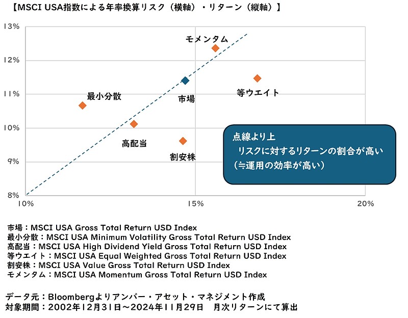 2002年末から2024年11月末までの期間で計測した年率換算リスクとリターンをプロットして、リスクに対するリターンの割合から運用の効率性を比較すると、米国株には以下の様な特性があります。