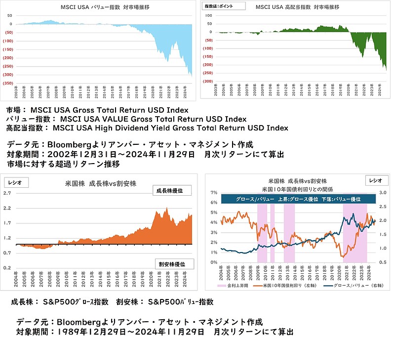 2点目の高配当指数や割安株指数ですが、2017年以降でマイナスとなっています。また、1990年以降で米国株の割安株と成長株とを比較すると、一貫して成長株が優位な動きとなっており、米国株は成長株が優位な市場であると言えます。