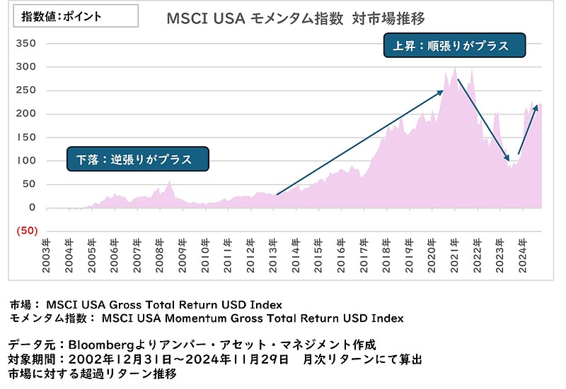 また、市場に対する運用効率ではやや良かったモメンタム指数について超過リターンの動きを見ると、全体ではプラスとなっていますが、時期によってはプラスの時期とマイナスの時期に分かれています。