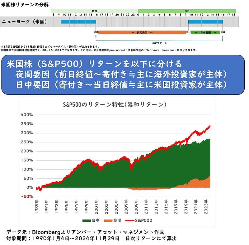 日中要因は米国投資家が主体となっています。1990年代からのプラスは日中要因のプラス寄与が主体となっており、 日中要因は米国投資家が主に主体となっています。1990年代から2010年代半ばまでのリターンは米国投資家の動向で説明できる状況でした。