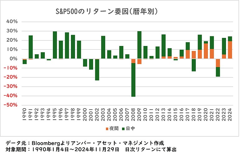 代表的な米国株指数であるS&P500の日次リターンを前日の終値から当日の寄付きまでのリターン(≒夜間要因)当日の寄付きから当日の終値までのリターン(≒日中要因)に分けて、1990年以降の累和リターンの推移を見ると、日中要因が主体であることと2017年以降に夜間要因のプラスが大きくなっていることが分かります。