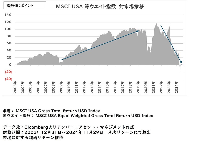 現在の米国株はマグニフィセント・セブン(M7)と呼ばれる大型テクノロジー銘柄がけん引していますが、一部の主力株が米国株を牽引する流れは2020年代から見られている事象となります。