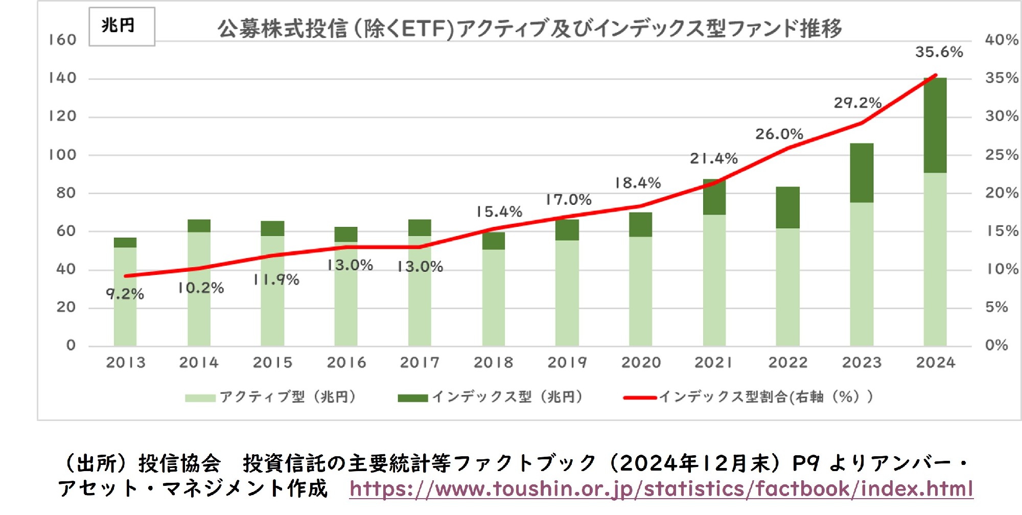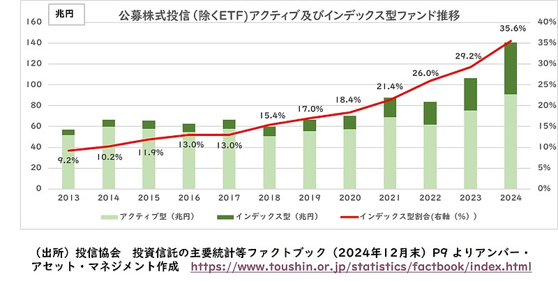 日本の公募投資信託(除くETF)の運用残高は2024年末で140兆円を超えています。そして、インデックス型投資信託の占める割合は2013年末には9.2%だったのが、2024年末では35.6%と大きく拡大していることが分かります。