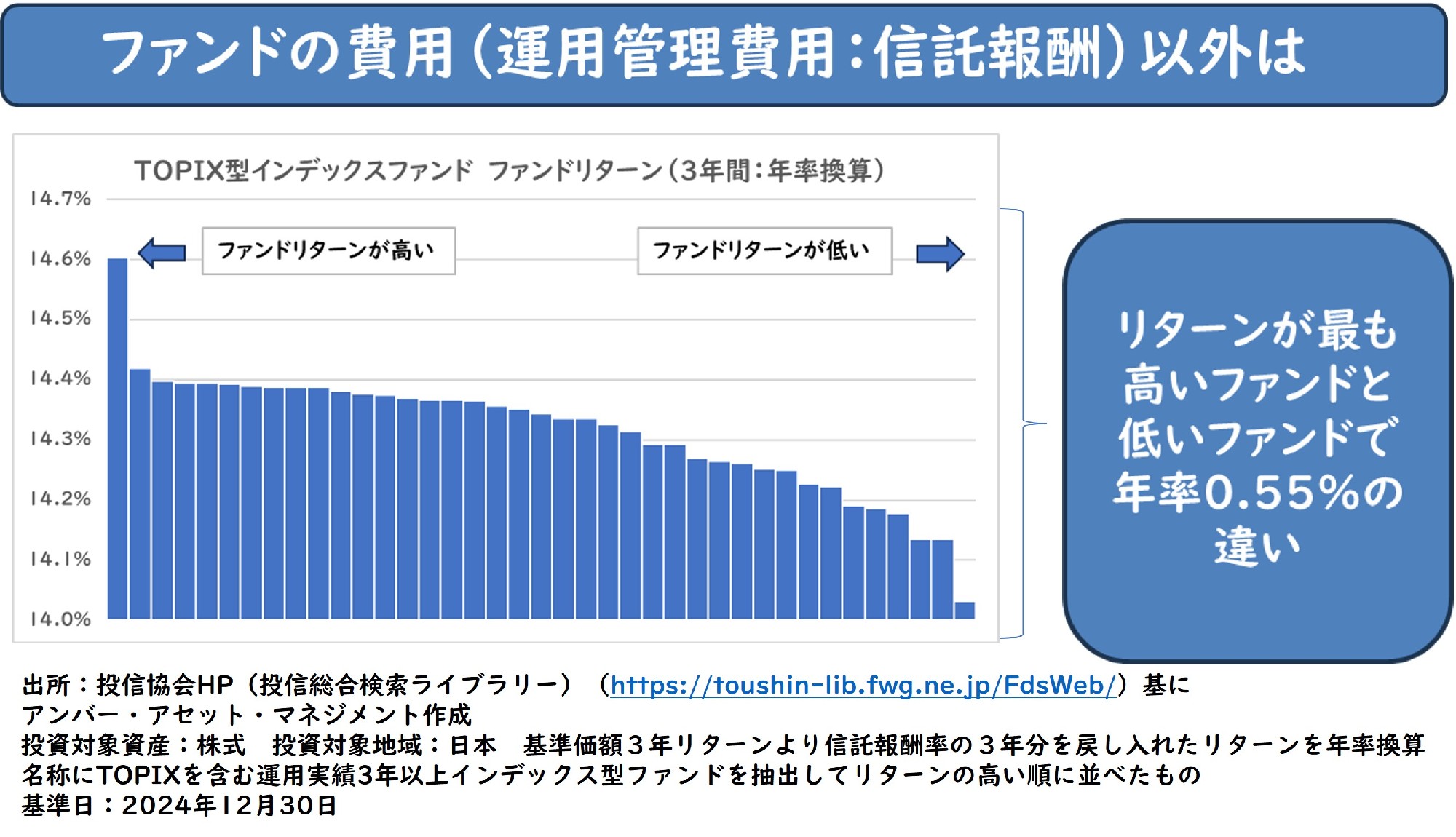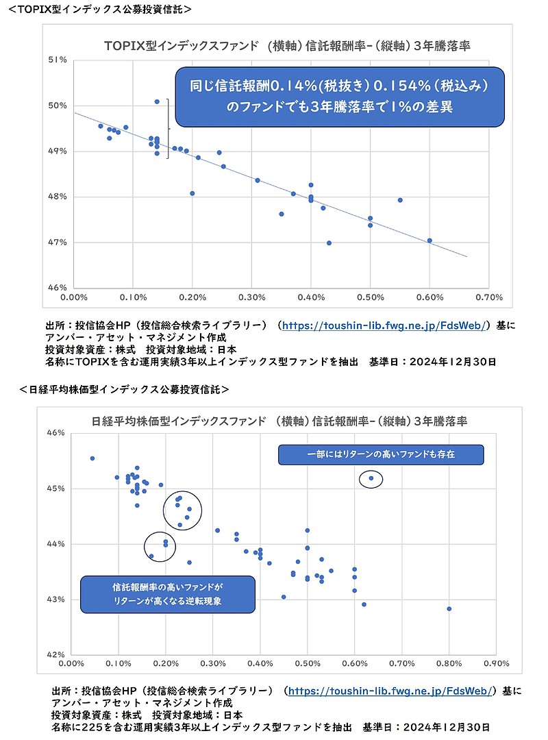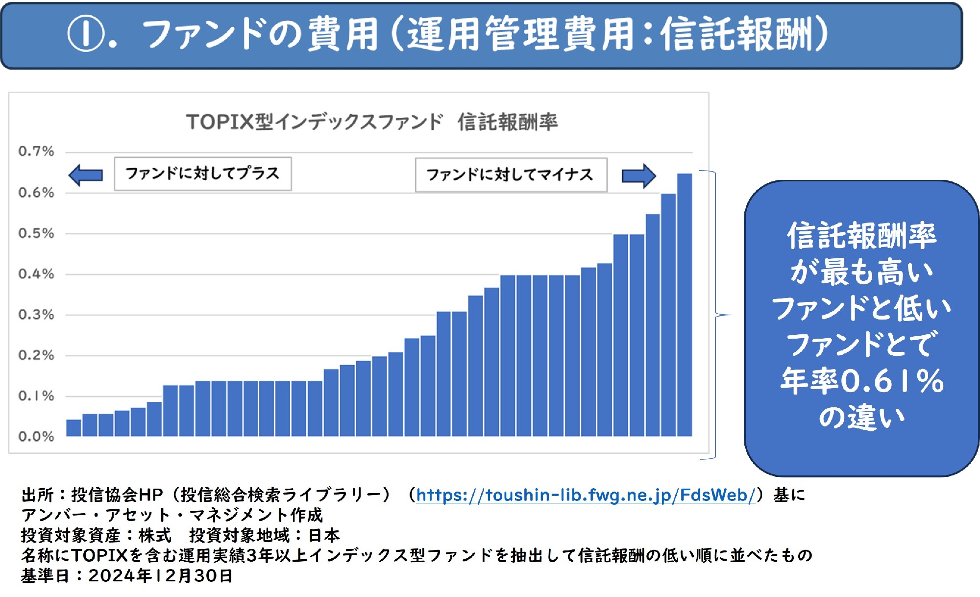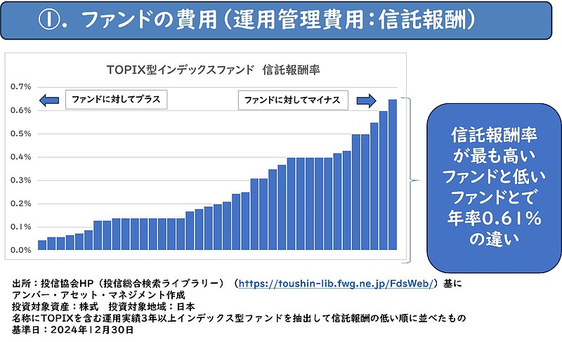 世の中でも知られている通り、同じインデックス型投資信託でも信託報酬率は異なり、2024年12月末時点で信託報酬率が最も高いファンドと最も低いファンドとの間で年率0.61%(税抜き)の違いがあり、ファンドの費用は重要な要素です。