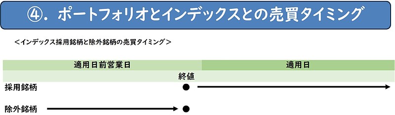 インデックス銘柄の入れ替えに伴う売買が発生するため、異なるタイミングで売買した場合にリターン乖離が発生します。