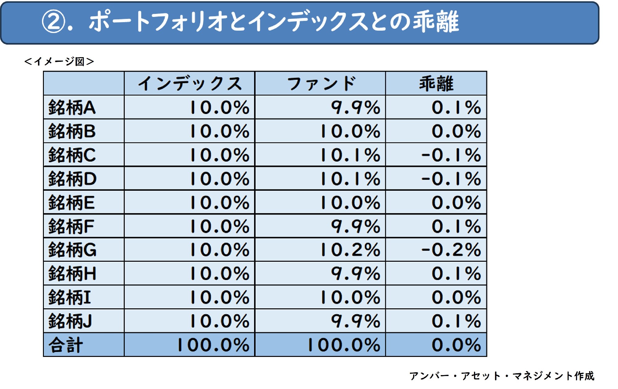 2点目はポートフォリオで保有する銘柄ウエイトとインデックスで保有する銘柄ウエイトの乖離です。ポートフォリオとインデックスで構成されるウエイトの違いによってリターン乖離が生じます。