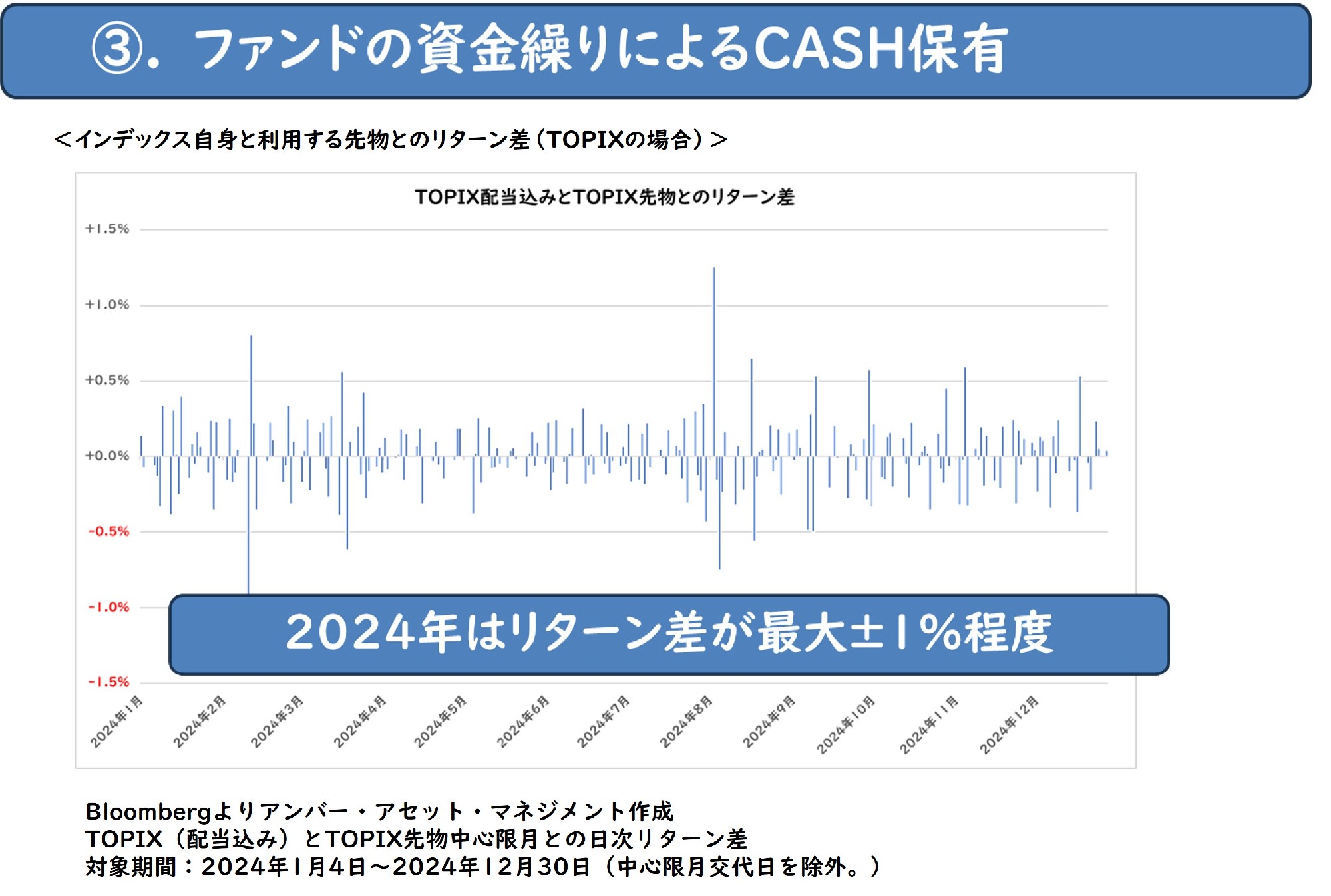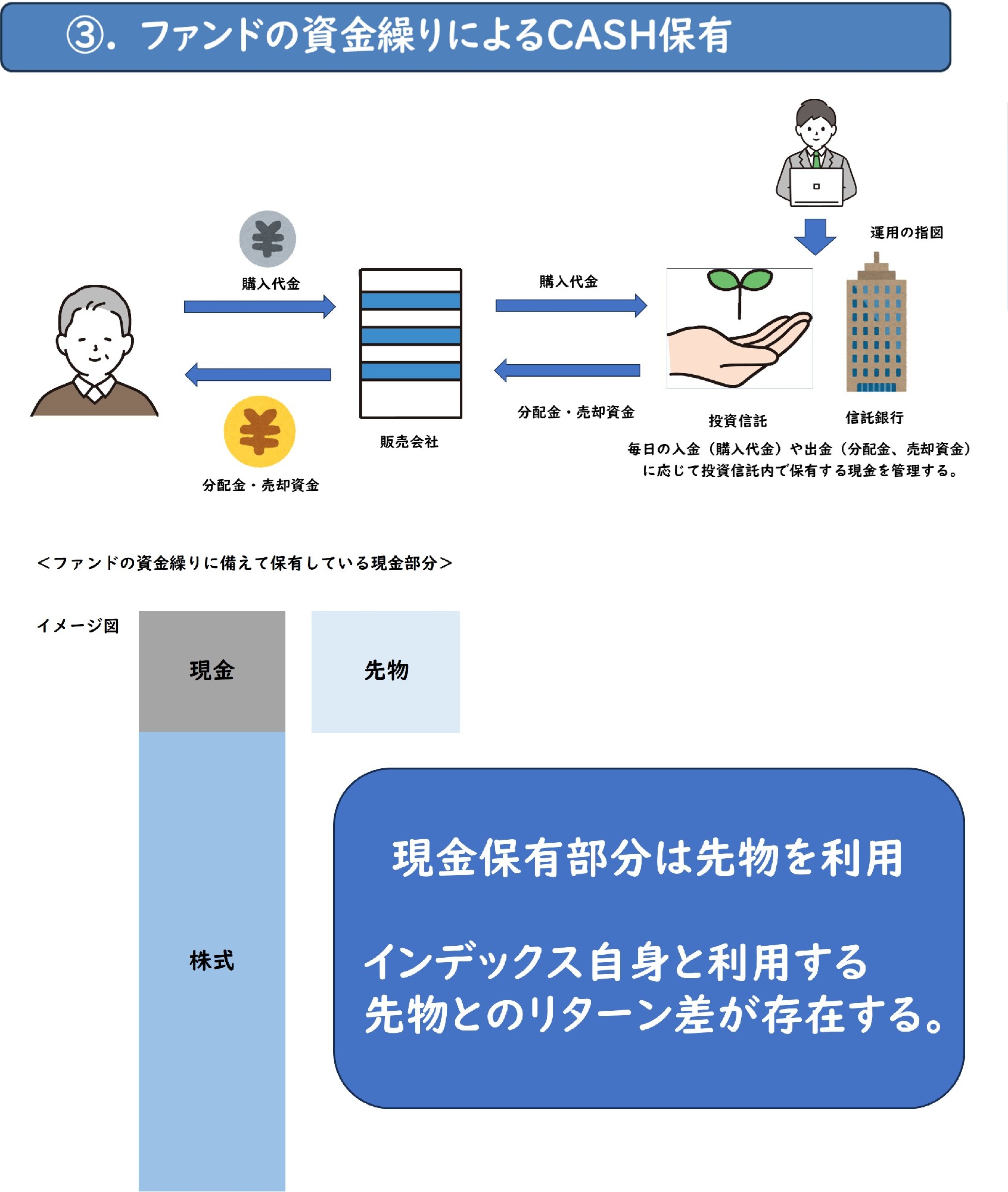 3点目はファンドの資金繰りに備えて保有している現金部分より生じるリターン乖離です。投資信託はお客さまからの設定解約が毎営業日あることから、その資金繰りに備えて一定割合の現金を保有しています。