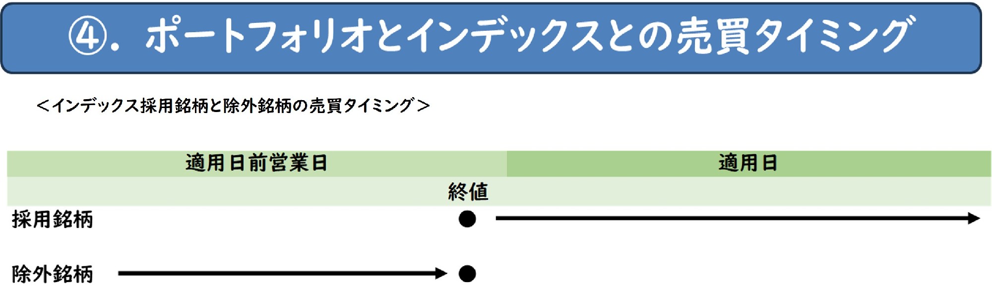 基本的にインデックスに採用される銘柄と除外される銘柄は適用日の前営業日の終値が売買の基準時点となります。