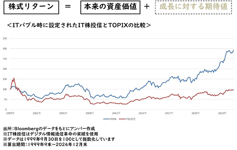 下のグラフはITバブル期に設定されたIT株投信とTOPIXの比較です。1999年に設定されてITバブル期は赤色のIT株投資の方が上になっていますが、その後大きく下がって成長に対する期待が剥脱して本来の資産価値だけが残ることになります。その結果、IT株投信はTOPIXに対して劣後する結果となっています。