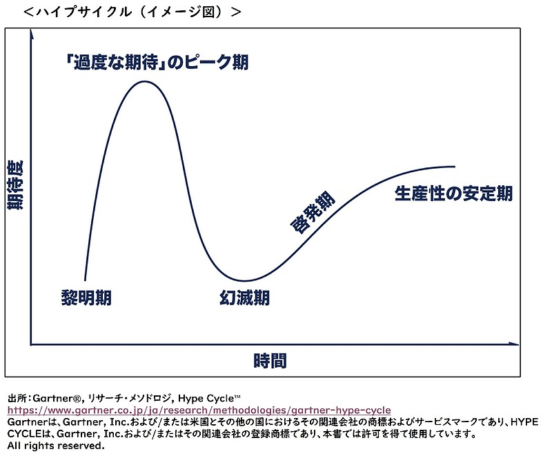 実際に投資する時点が過度な期待のピークになっていると、将来の利益は過剰に織り込まれて既に割高になっていることが多いと思います。そのため、買った後にその後のサイクルである幻滅期に入って投資家の関心が下がると、株価は下がりやすいということになります。