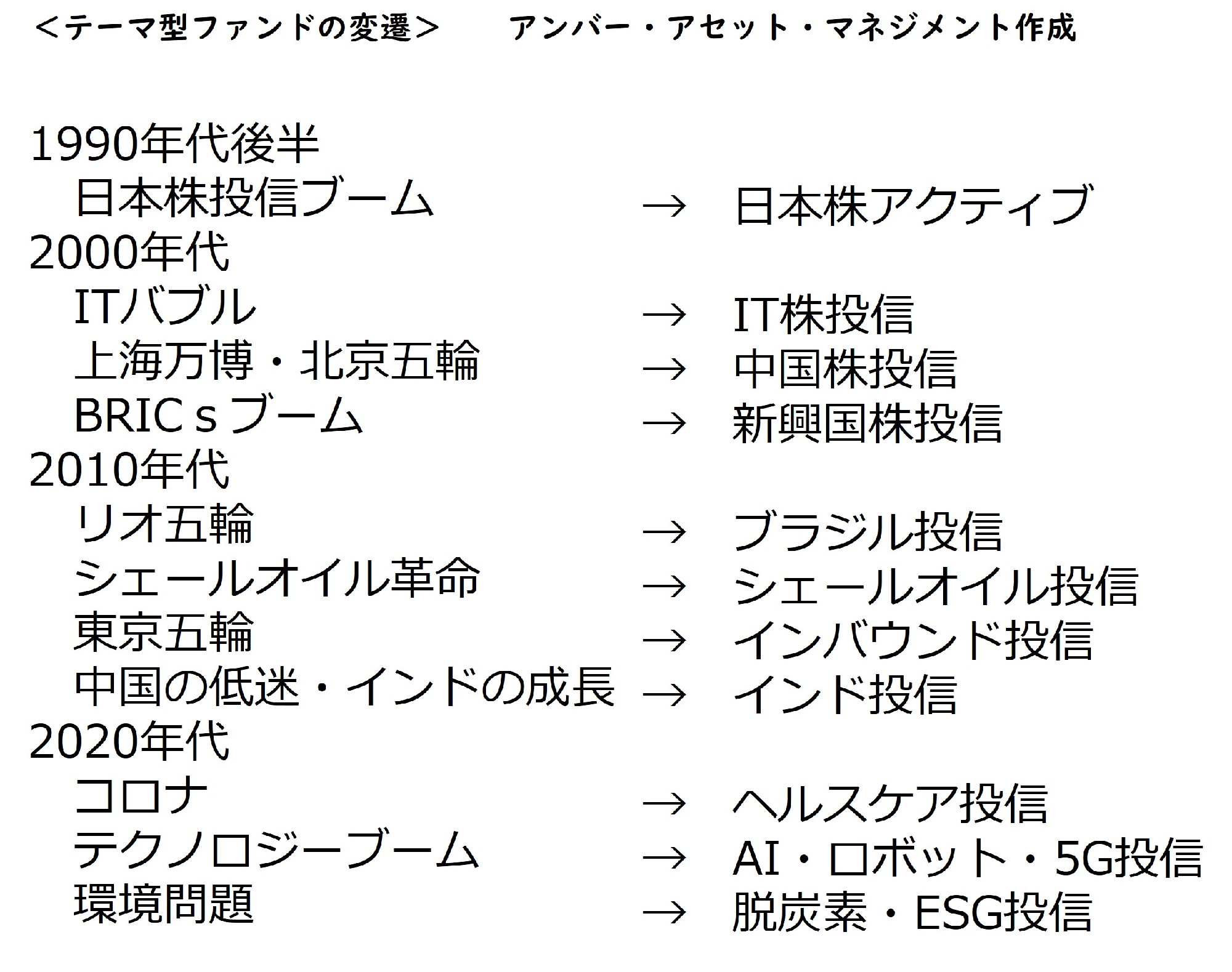 まずは日本の公募投資信託で流行ったテーマ型ファンドの歴史を概観してみたいと思います。