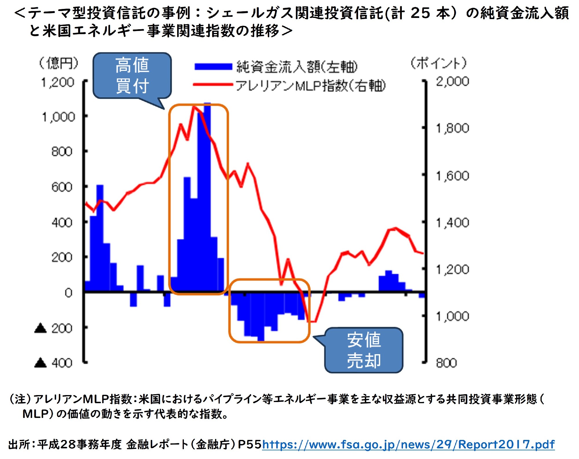 但し、実際に投信を販売された頃にはシェールガスはピークを過ぎていました。その後は価格が下がり、資金も流出に転じていることも分かるかと思います。