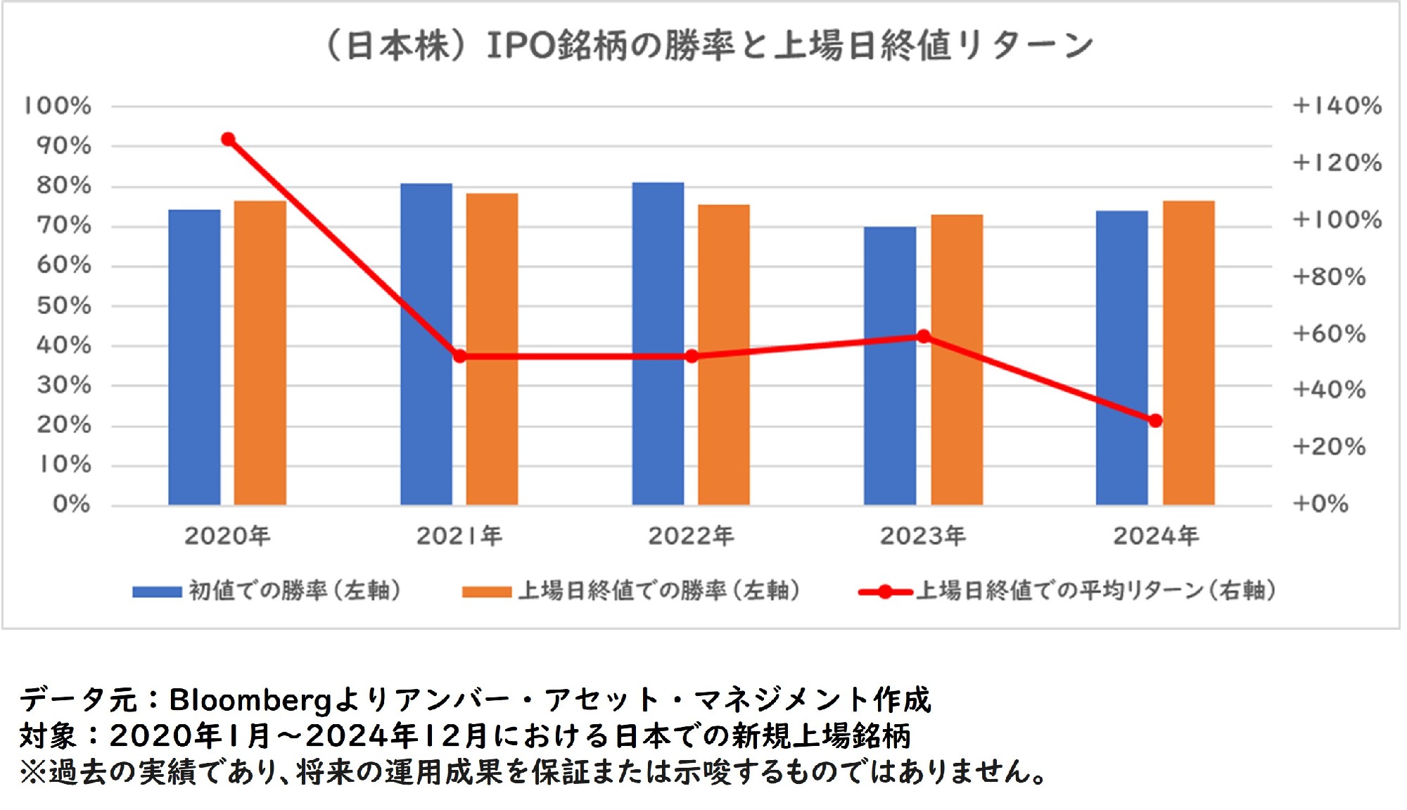 一般的にIPOの初値売りは公募価格を上回る勝率が高いと言われていますが、2020年から2024年に新規上場した日本株では、初値が公募価格を上回る勝率及び上場日終値で公募価格を上回る勝率は総じて70~80%程度となっています。