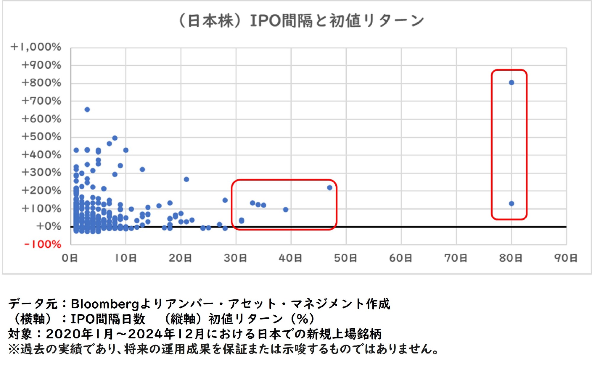 また、IPO銘柄の初値リターンは公募価格を上回る勝率が高いのですが、新規上場する間隔が空いた際の久し振りのIPOとなった場合にはリターンが高くなる傾向が見られています。