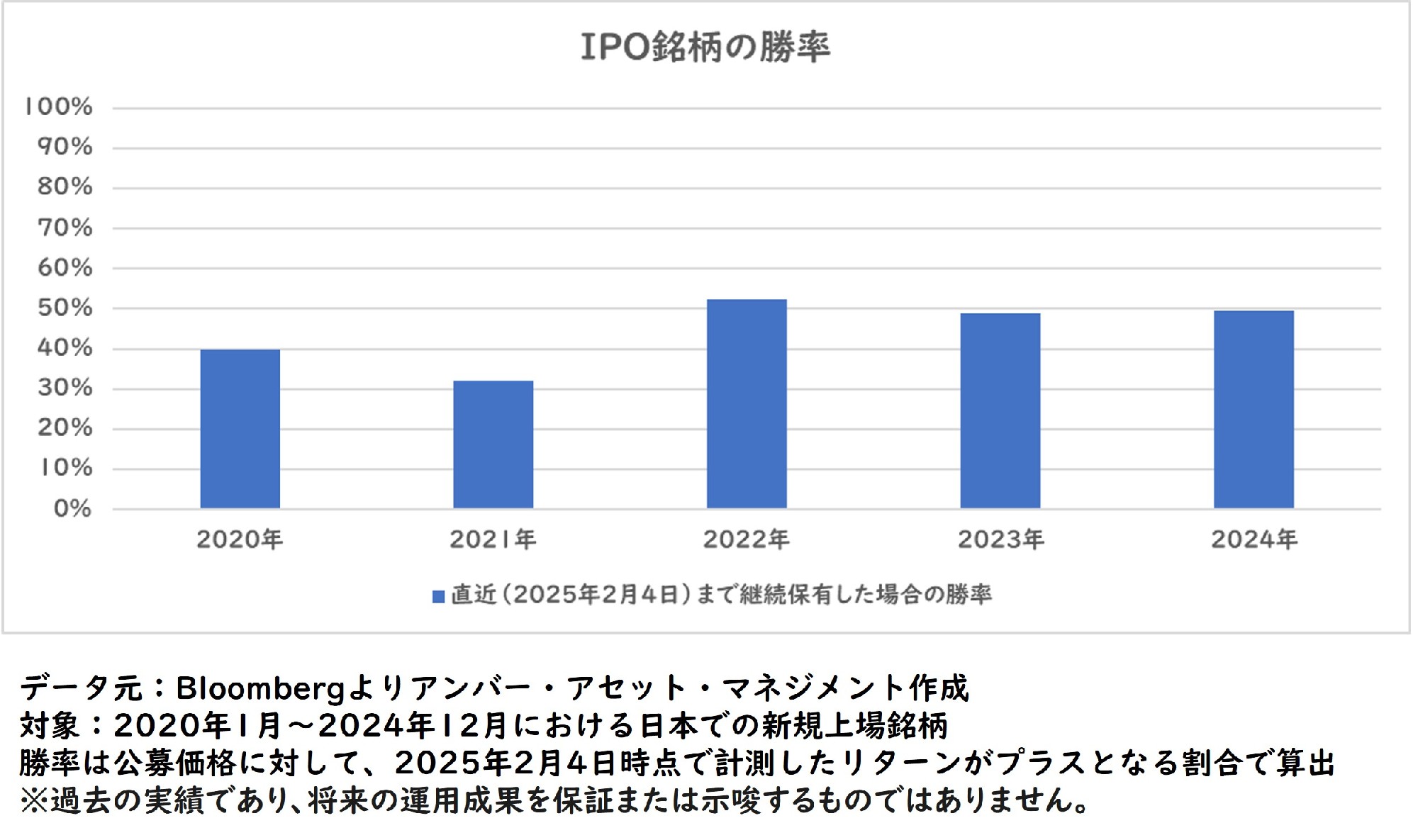 更にIPO銘柄を継続保有した場合を見てみると、2020年から2024年までの新規上場銘柄についてデータを取得した2025年2月4日時点の株価にて公募価格を上回っている勝率は5割を下回ります。