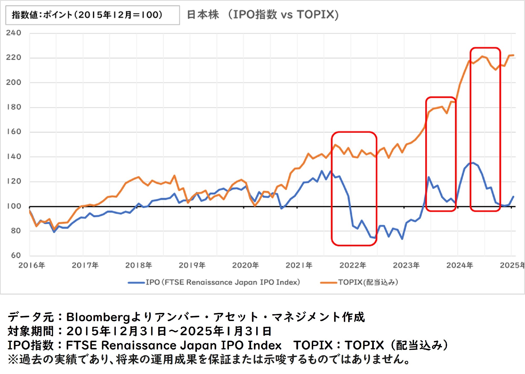IPO指数は市場が上昇している際は同様に上昇しますが、市場の上昇が一服すると利益確定売りで下落する傾向が見られます。IPO銘柄には様々な企業があり、玉石混交と言えます。