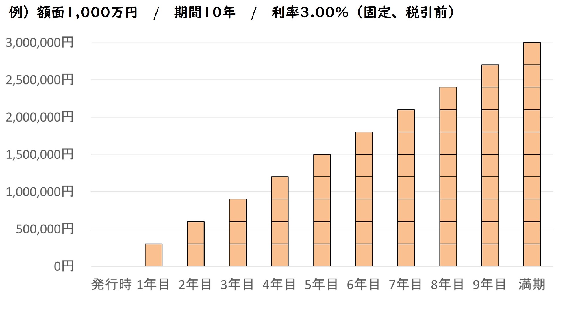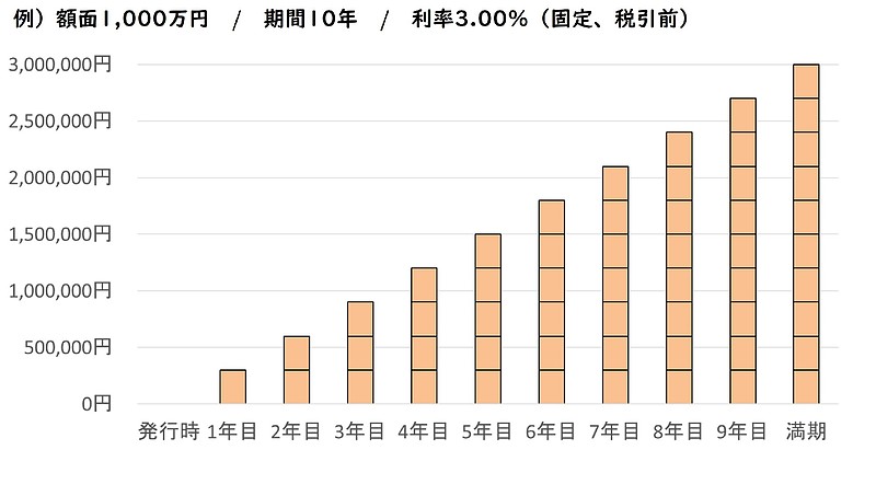 額面1000万円、期間10年間、利率が3%で税金は考慮しない簡単な例で、発行してから満期までの10年間で利金が積み上がって10年間で300万円入ってきます。