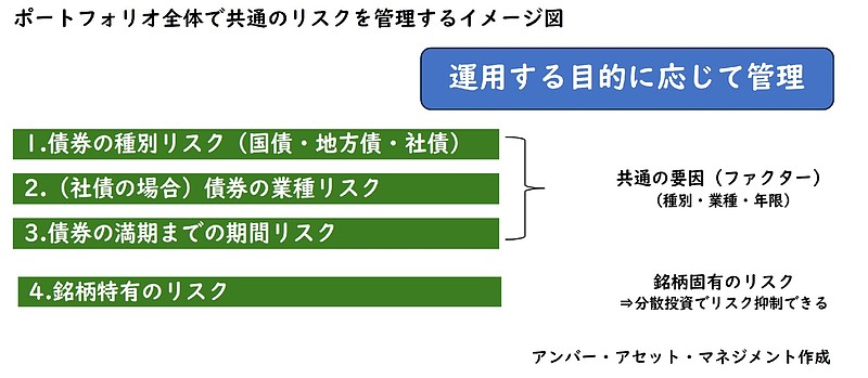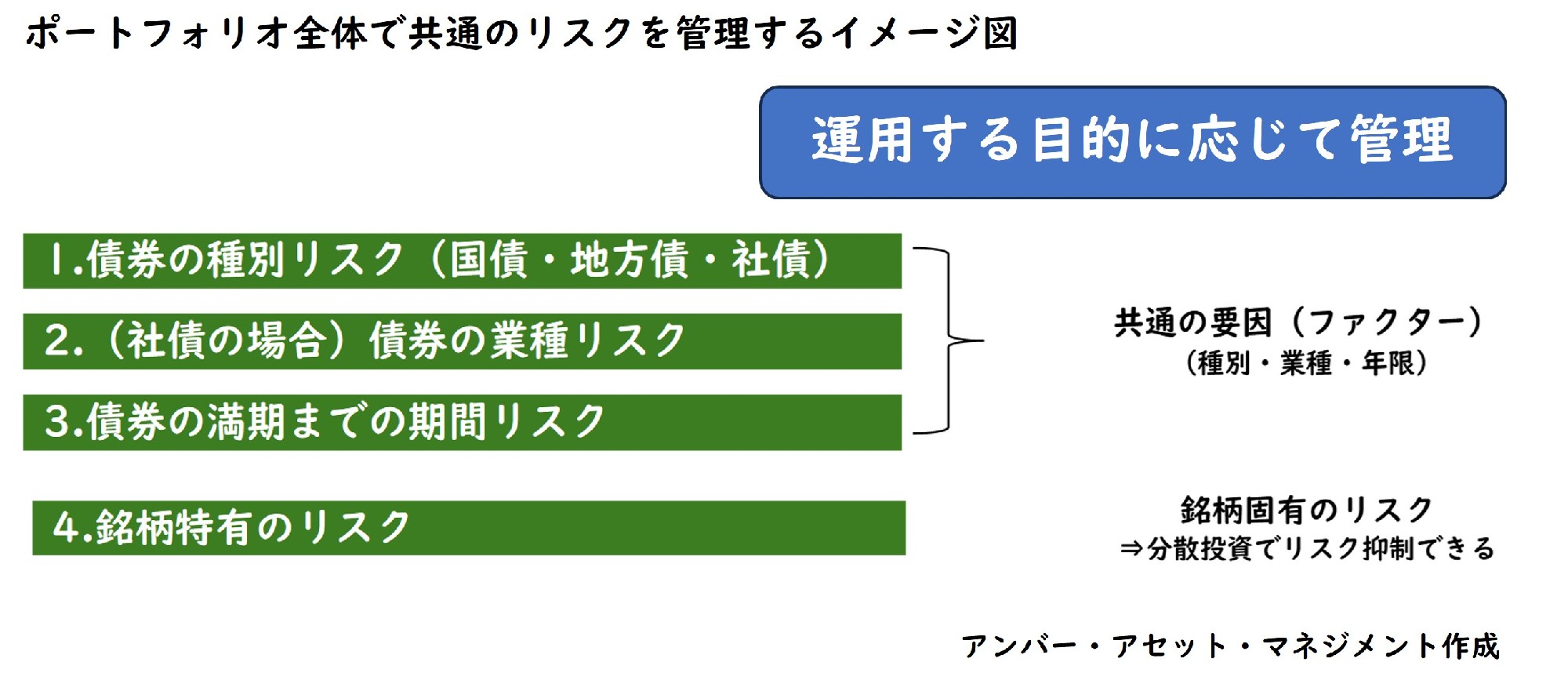 一方で分散投資でも共通のリスクは残るので、債券全体を管理する際には、この共通のリスクである種別や業種、期間の構成割合を管理しながらポートフォリオを運用します。