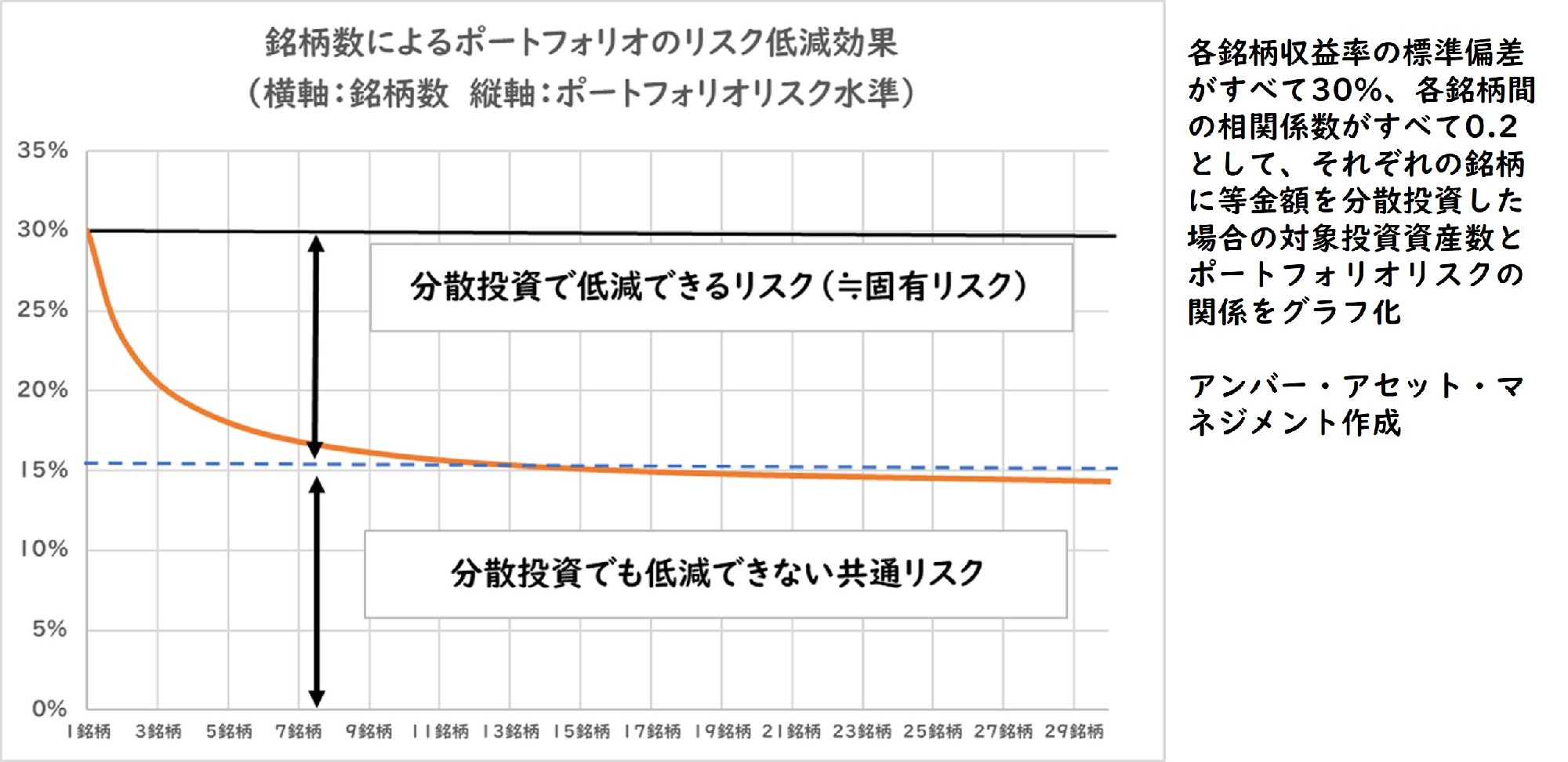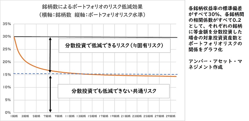 債券のポートフォリオの場合も、株式と同じように複数の異なる銘柄で分散投資することで固有リスクと言われる部分は徐々に低下します。