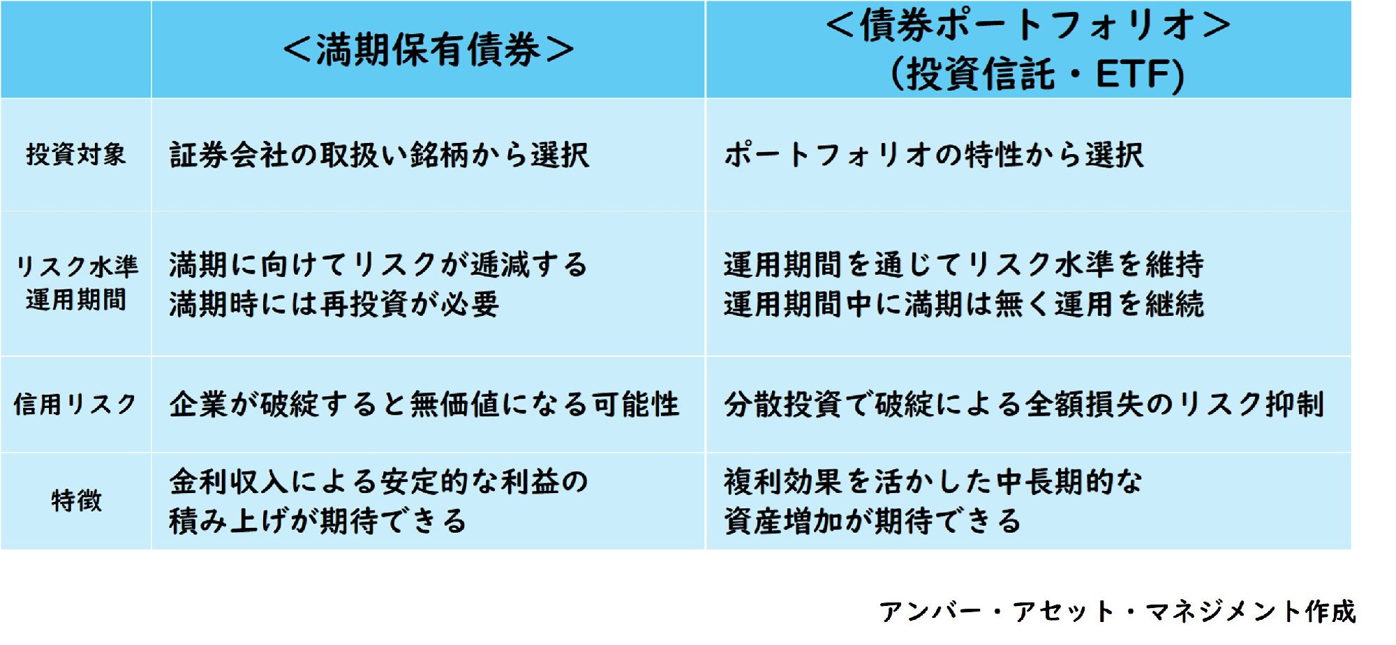 投資するお金があらかじめ使う予定が決まっているお金、例えば5年後に使うお金とかの部分であれば、その5年の満期に合わせた形で満期保有債券を活用するのがニーズに適合していますし、安定的な資金で運用したいという場合に当面使う予定が無いものであれば、債券ポートフォリオを活用して複利効果を生かした形で運用することがメリットを享受できることになります。