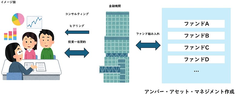 ファンドラップは最近CMなどでもよく見かける、金融機関が積極的に販売している運用商品で、この図のように投資家が金融機関と投資一任契約を結び、資産の投資判断・管理を専門家に一任する金融サービスです。